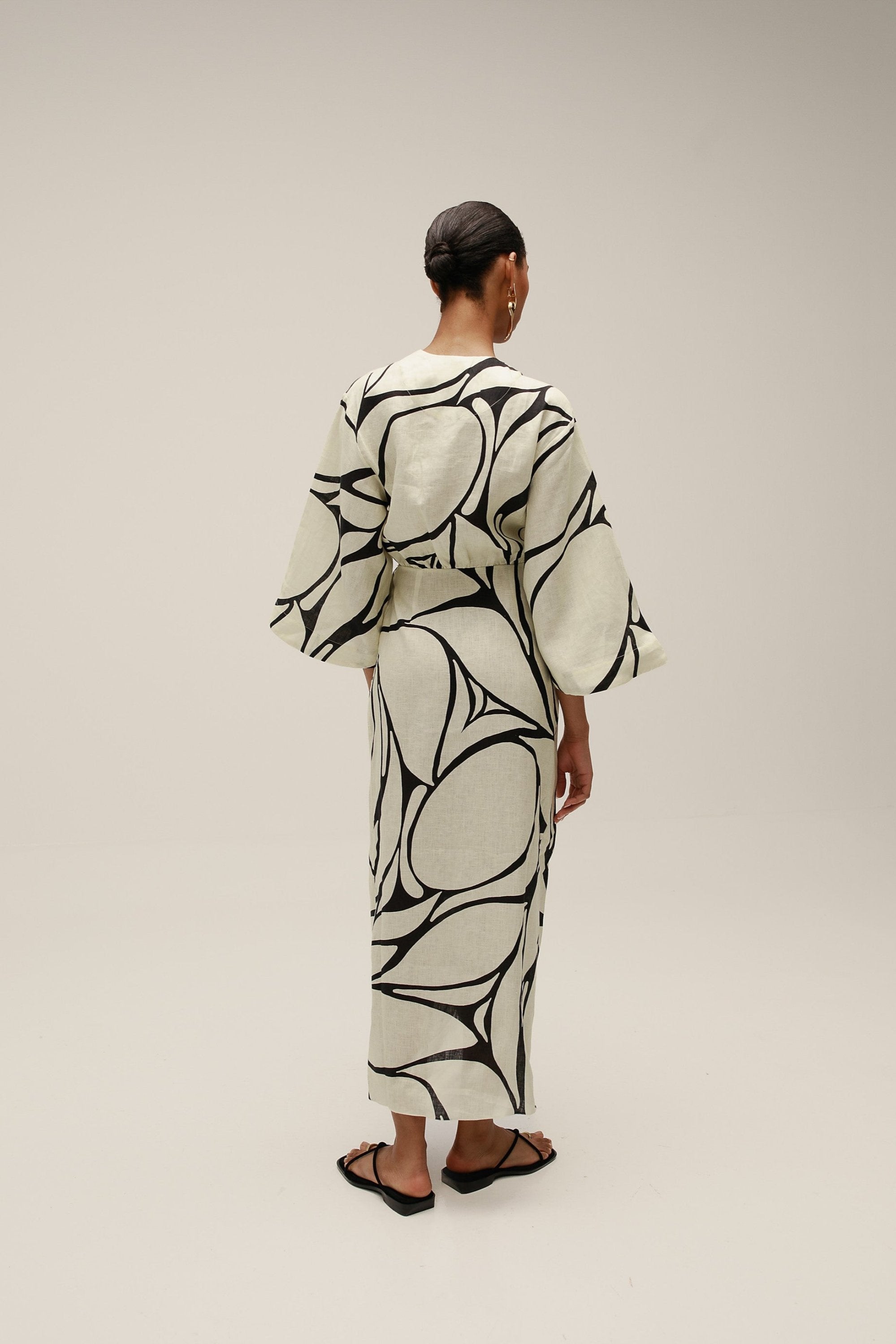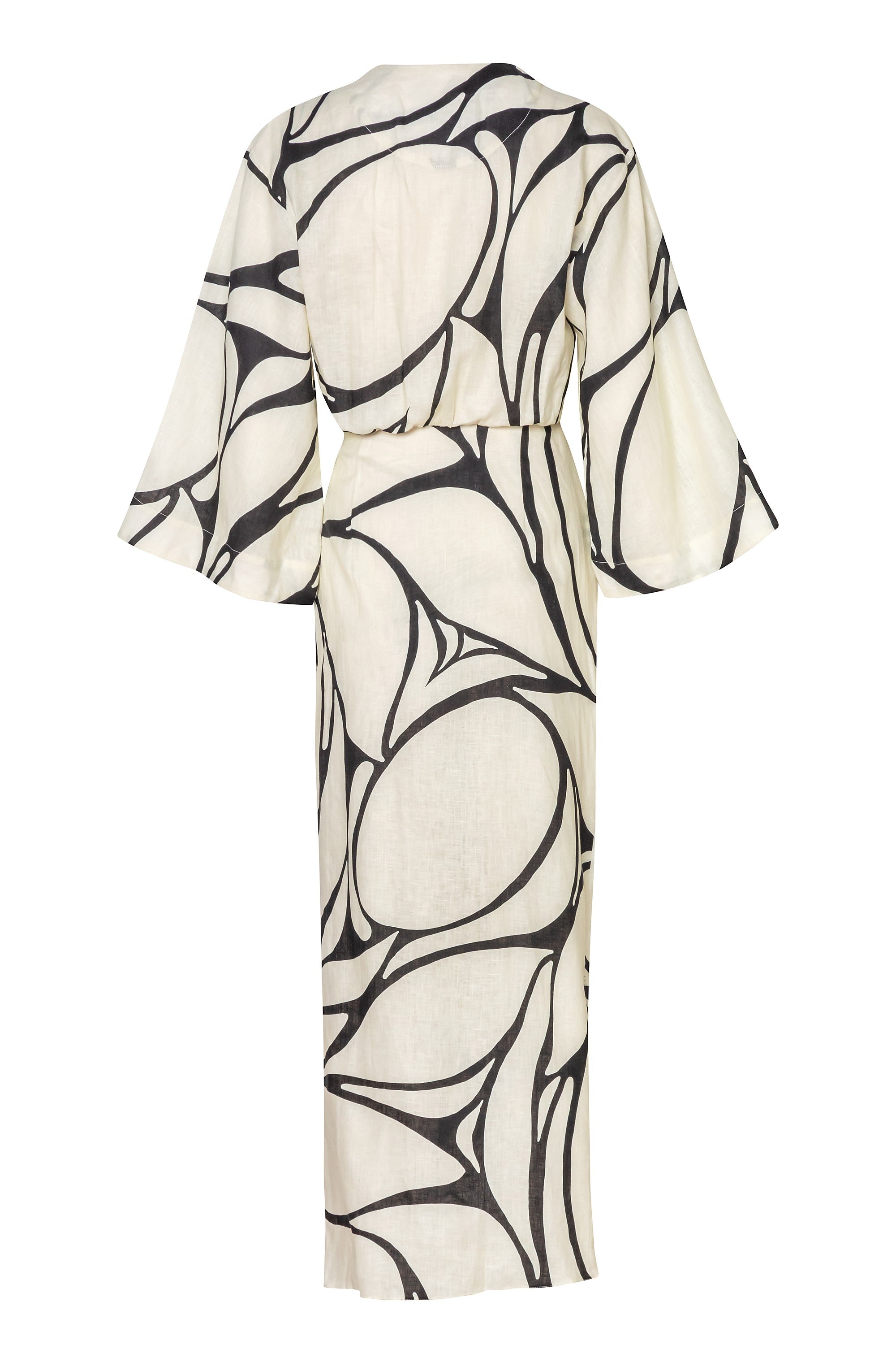 Vestido largo con escote en V profundo y falda cruzada con mangas estilo kimono. Hecho de 55% lino, 45% algodón.