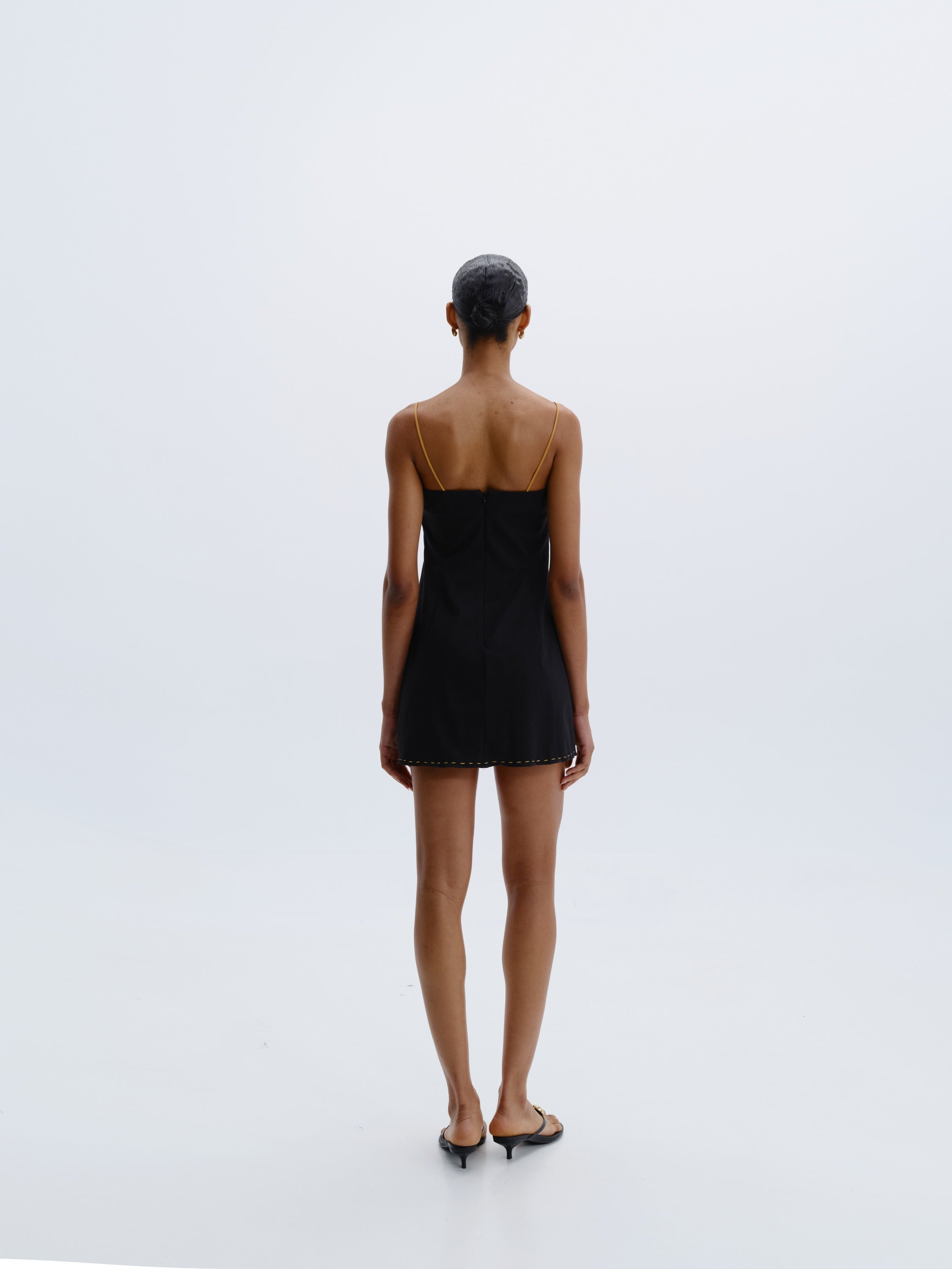 Minivestido de escote recto y silueta holgada+ con flores bordadas en el escote y pespuntes de contraste en el dobladillo. Completamente forrado. Hecho de 96.5% Algodon 3.5% Elastano.