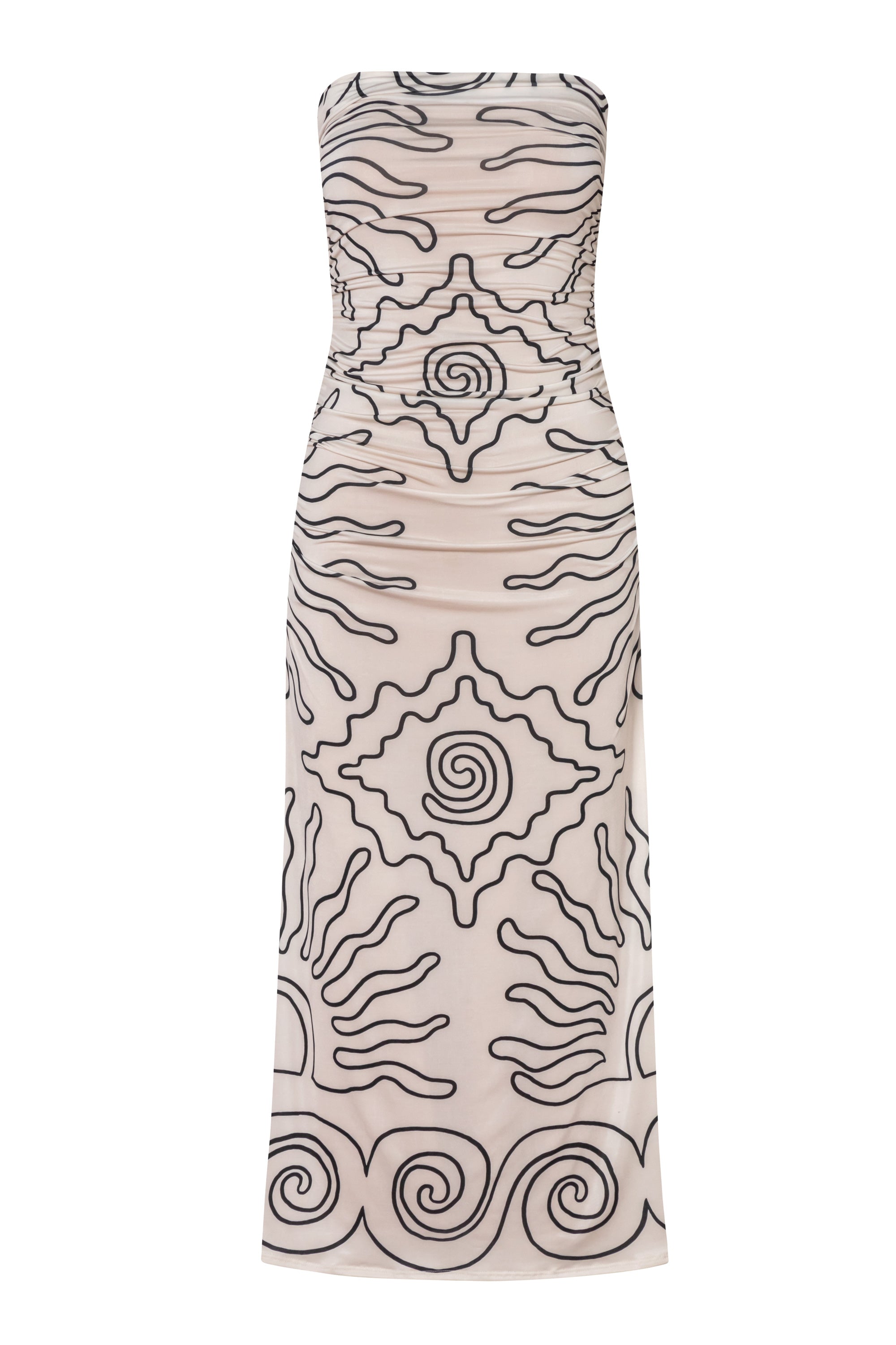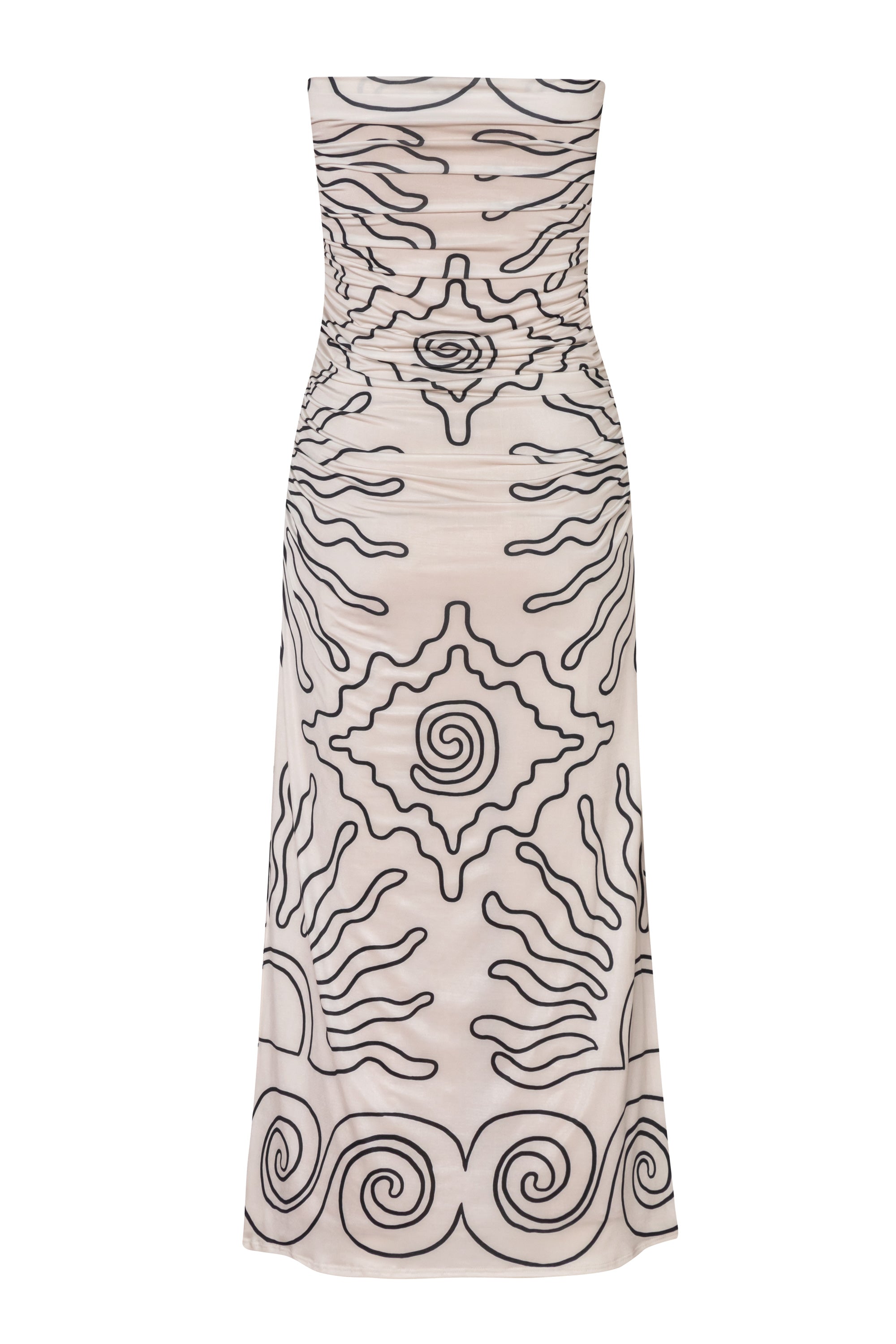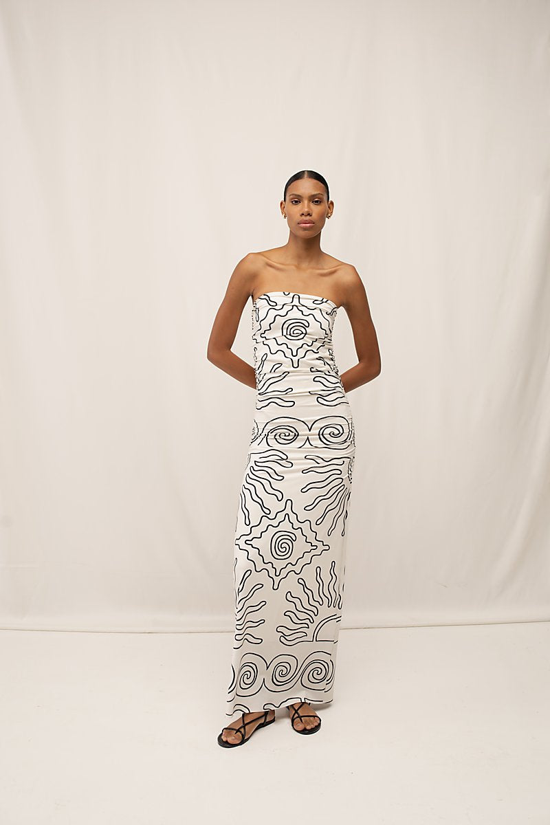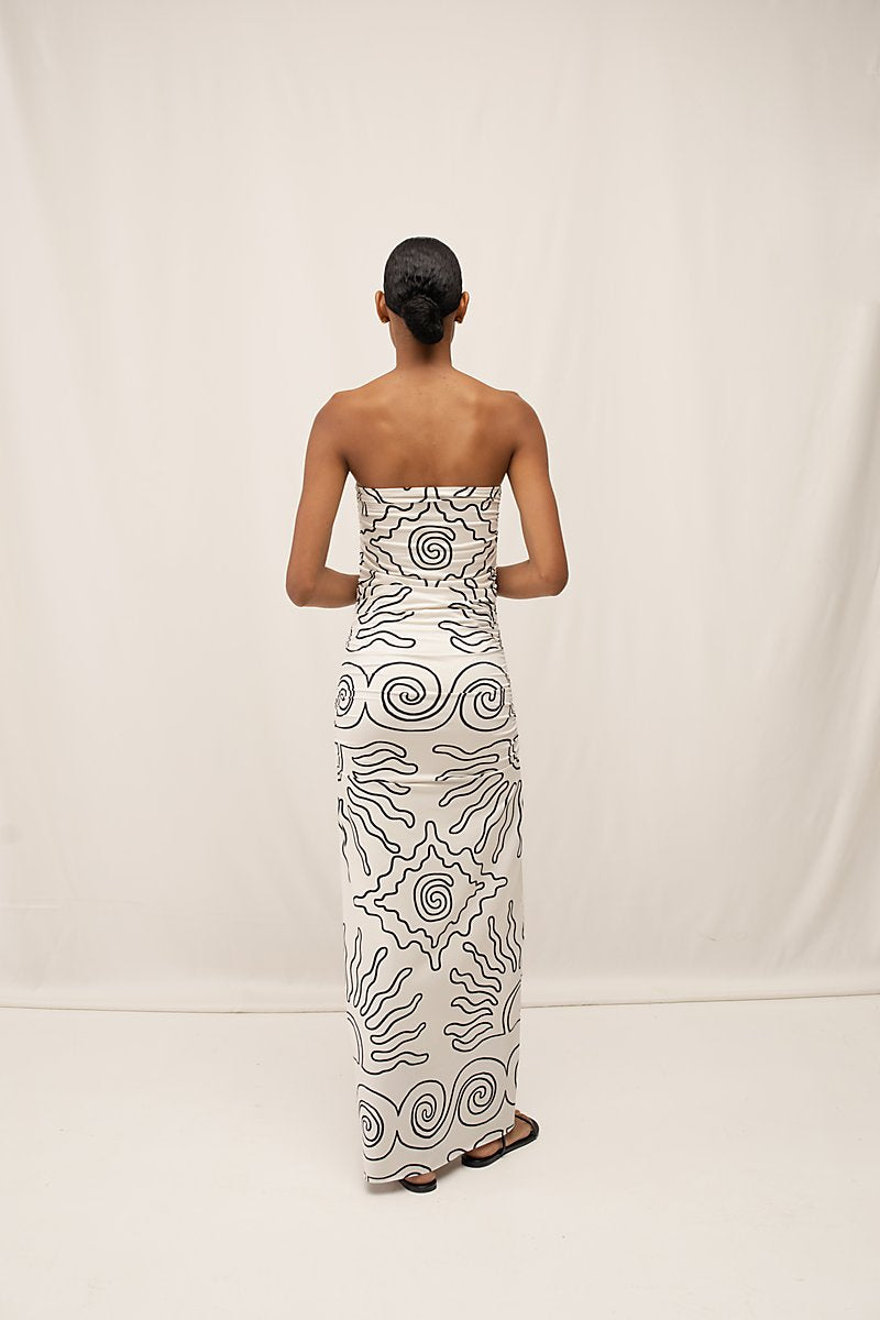 Vestido largo strapless con detalles de recogido en los laterales. Completamente forrado. Hecho de 92% poliester 8% elastano.