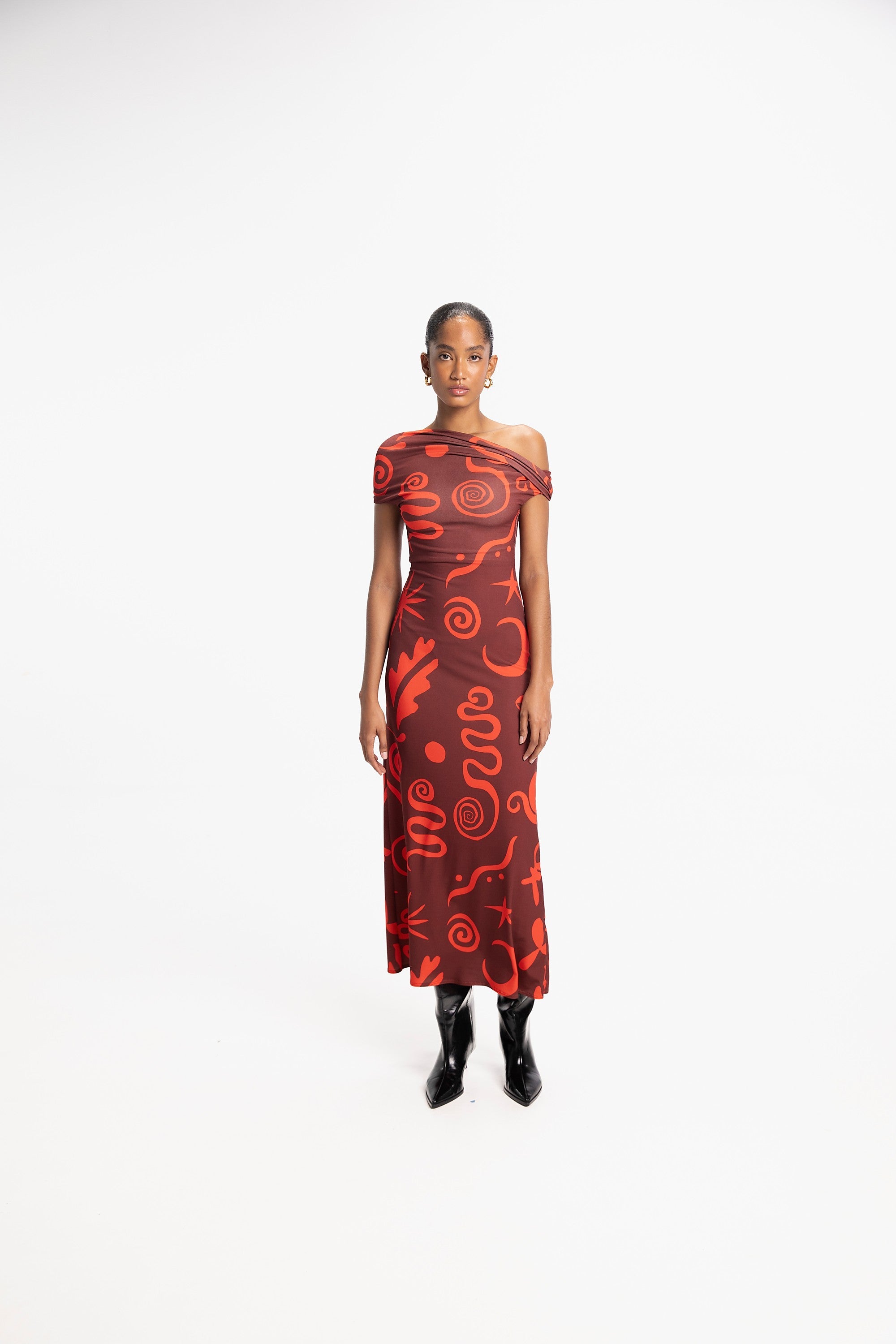 Vestido largo de manga corta con escote asimétrico plegado sobre los hombros y detalle de nudo. Hecho 95% Poliester 5% Elastano.