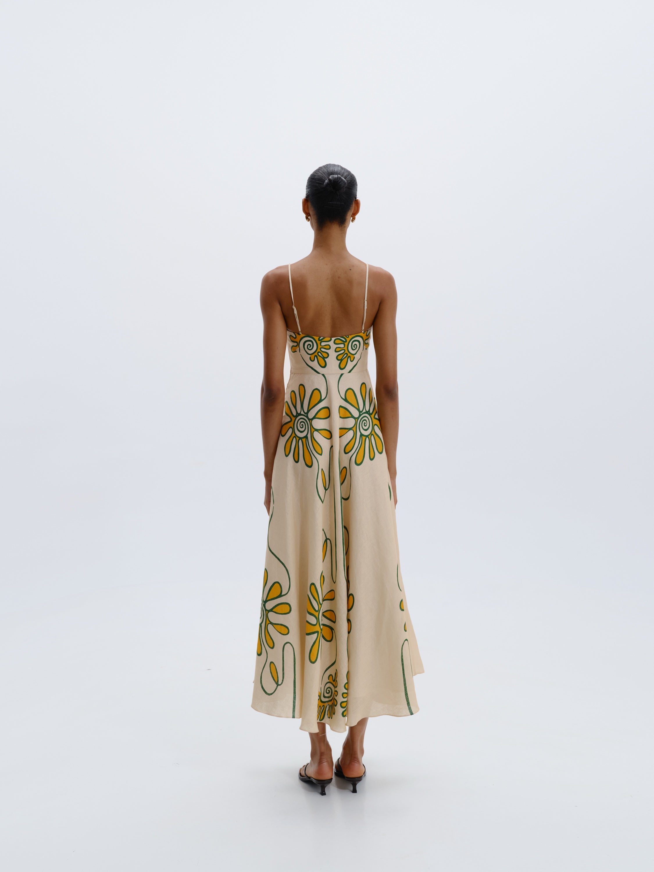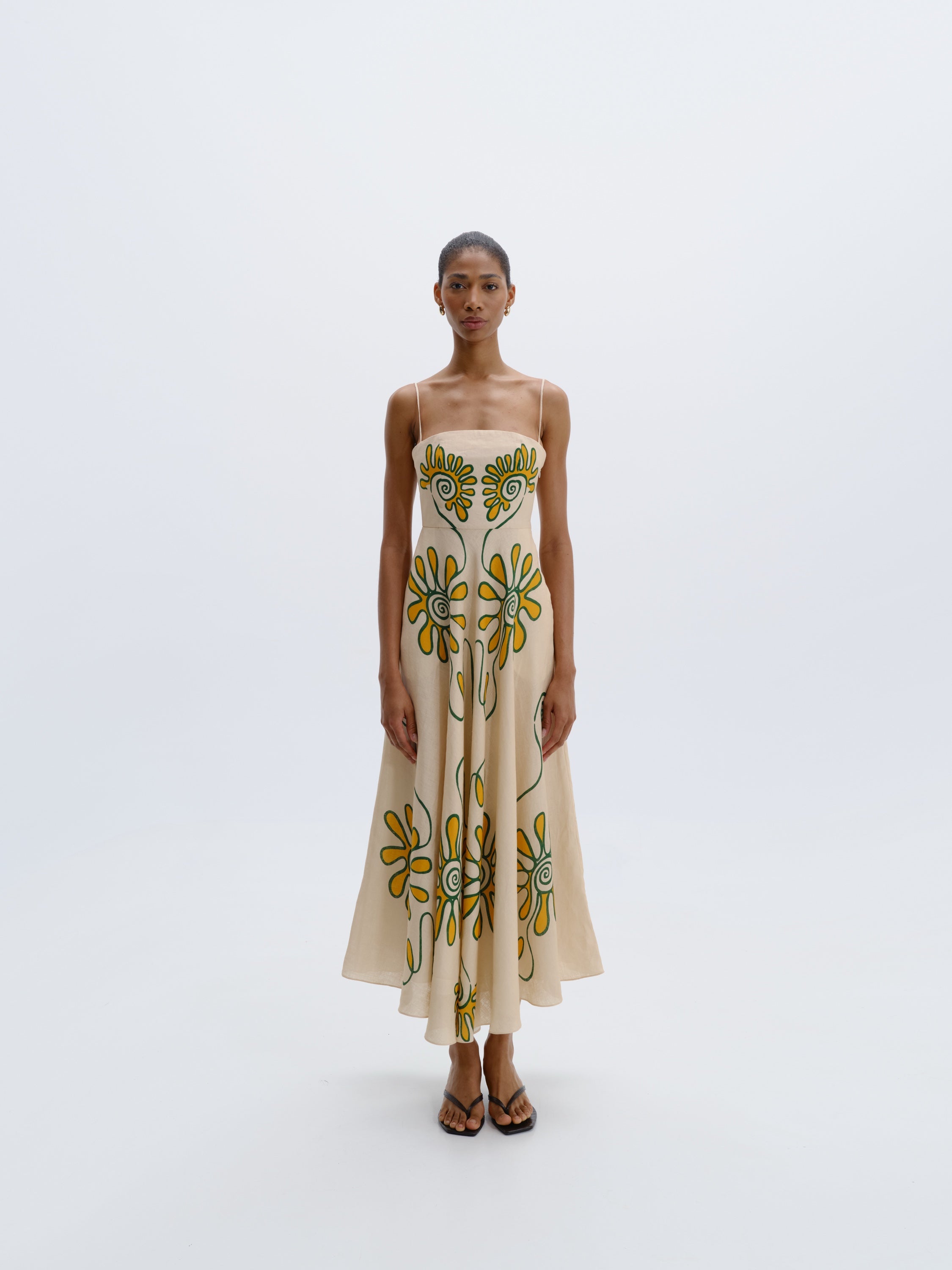 Vestido midi con escote recto+ parte superior entallada y falda acampanada. Totalmente forrado. Hecho 100 % de Lino.
