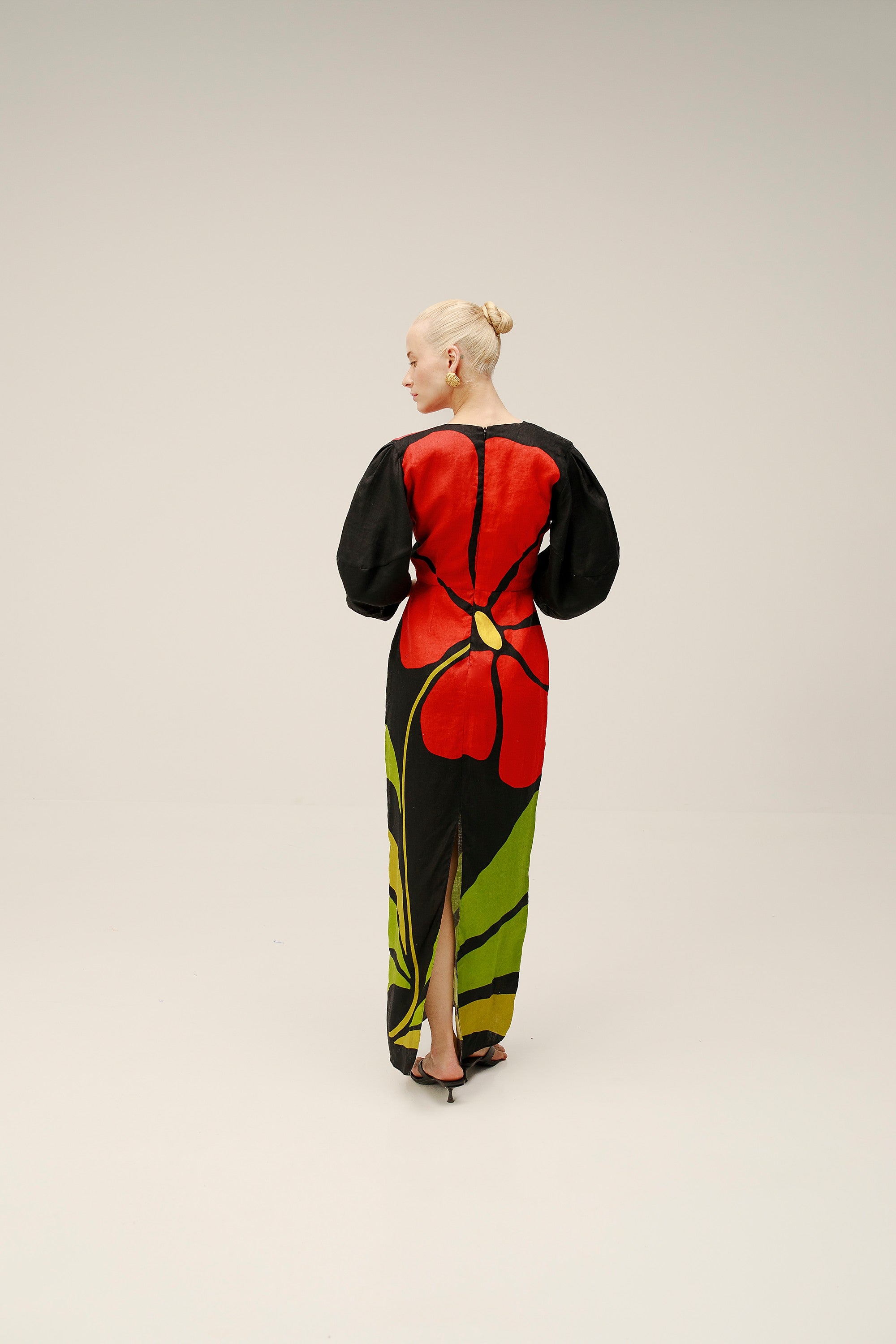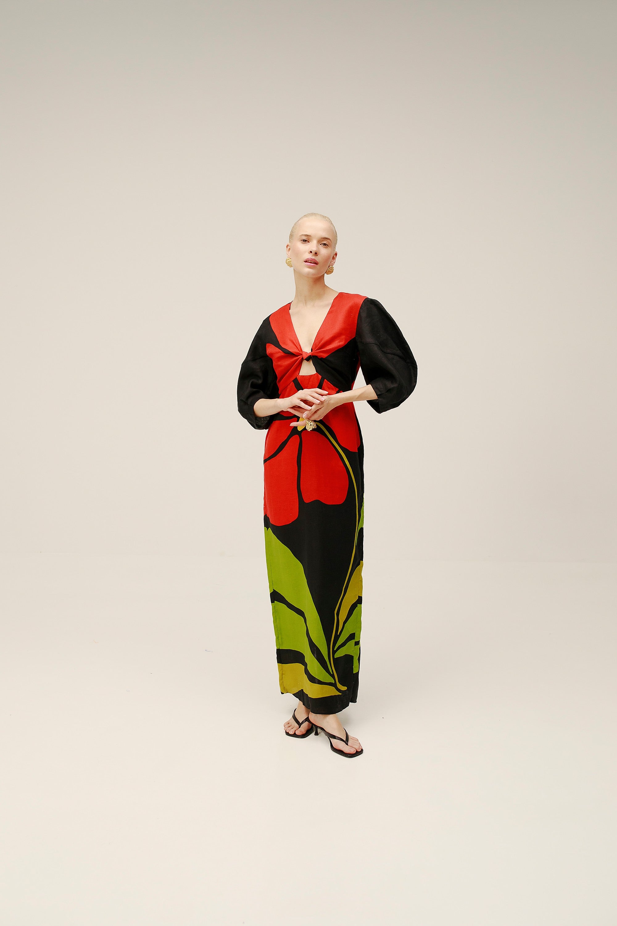 Vestido largo con mangas estilo puff, con abertura y detalle de nudo en el top delantero. Completamente forrado. Hecho de 100% Lino