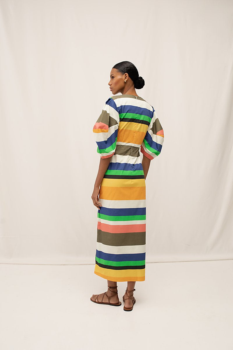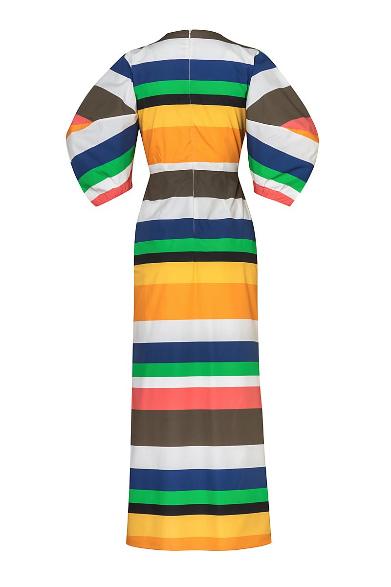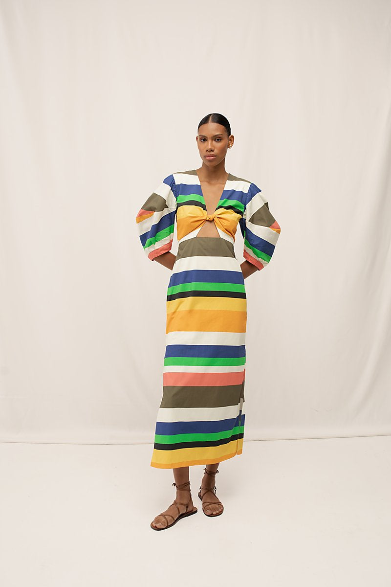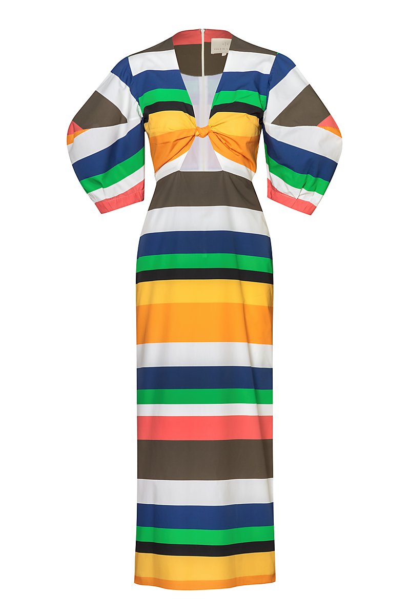 Vestido largo con mangas estilo puff con abertura y detalle de nudo en parte delantera. Top forrado. Hecho de 100% algodón.