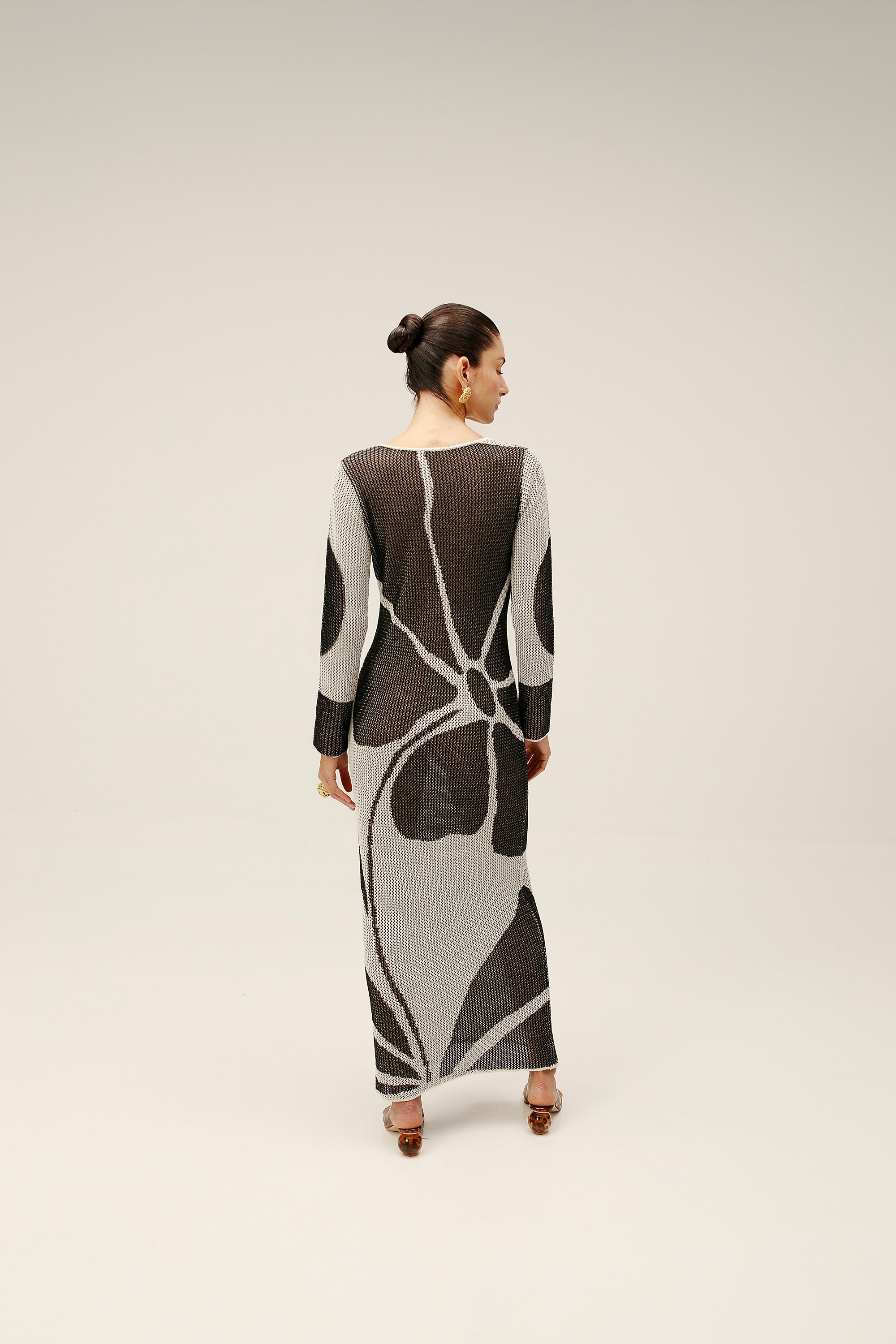 Vestido largo tejido, con mangas largas, escote en V profundo con detalle de argolla. Hecho de 75% acrilico 25% algodón pima