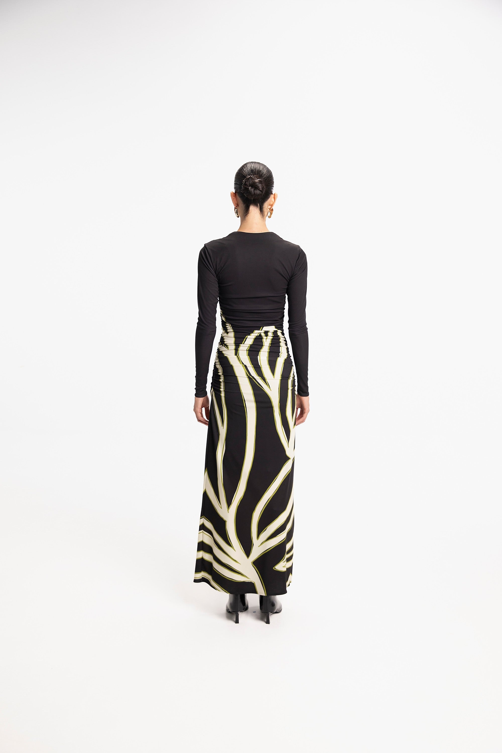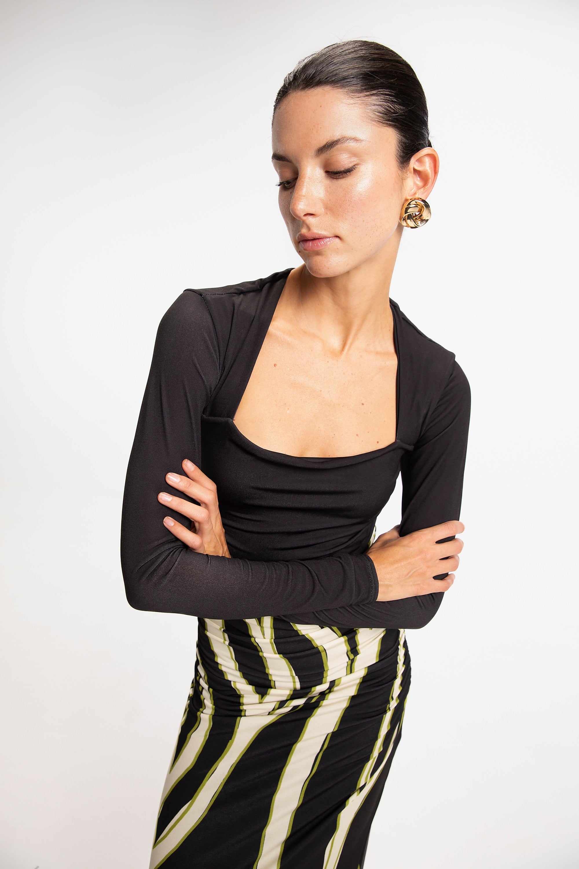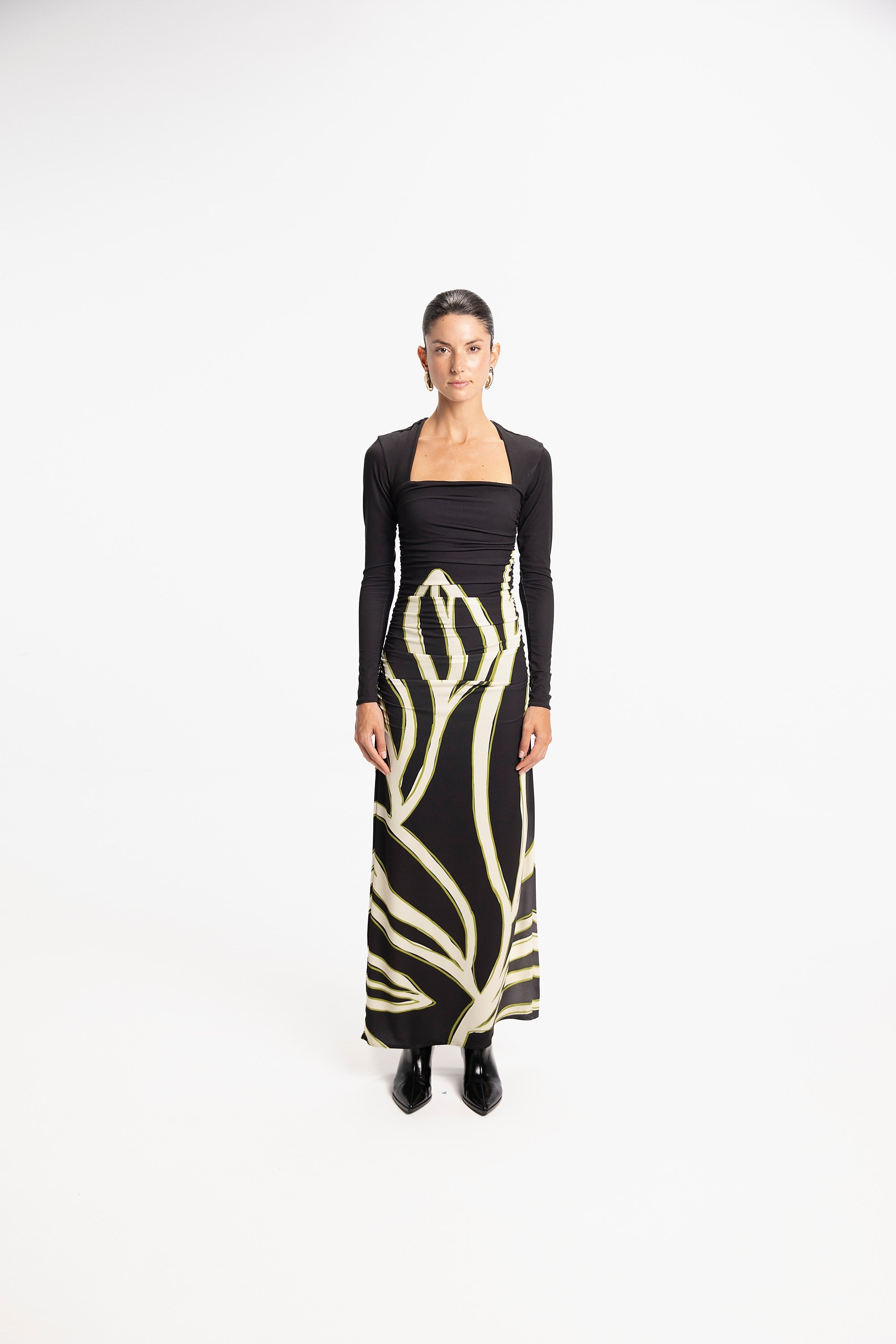 Vestido largo tejido+ con mangas largas+ escote en V profundo con detalle de argolla. Hecho de 95% Poliester 5% Elastano.