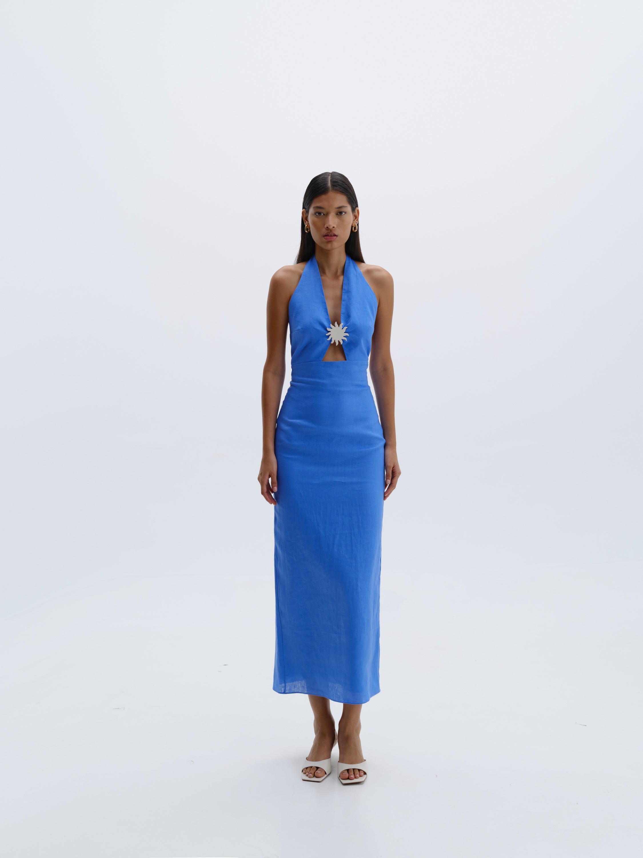 Vestido estilo halter sin espalda con abertura central en el frente y herraje en forma de sol. Totalmente forrado. Hecho 100 % de Lino.