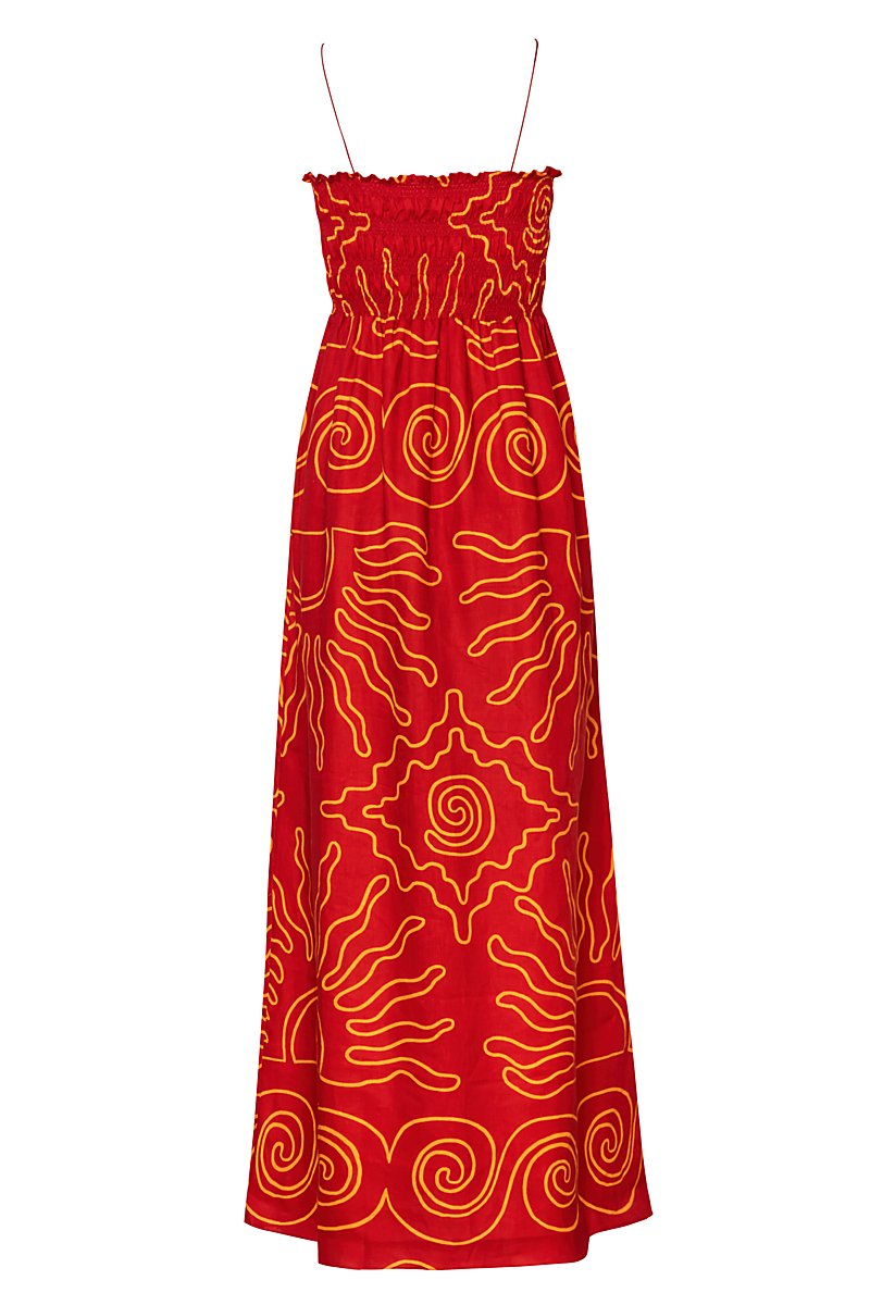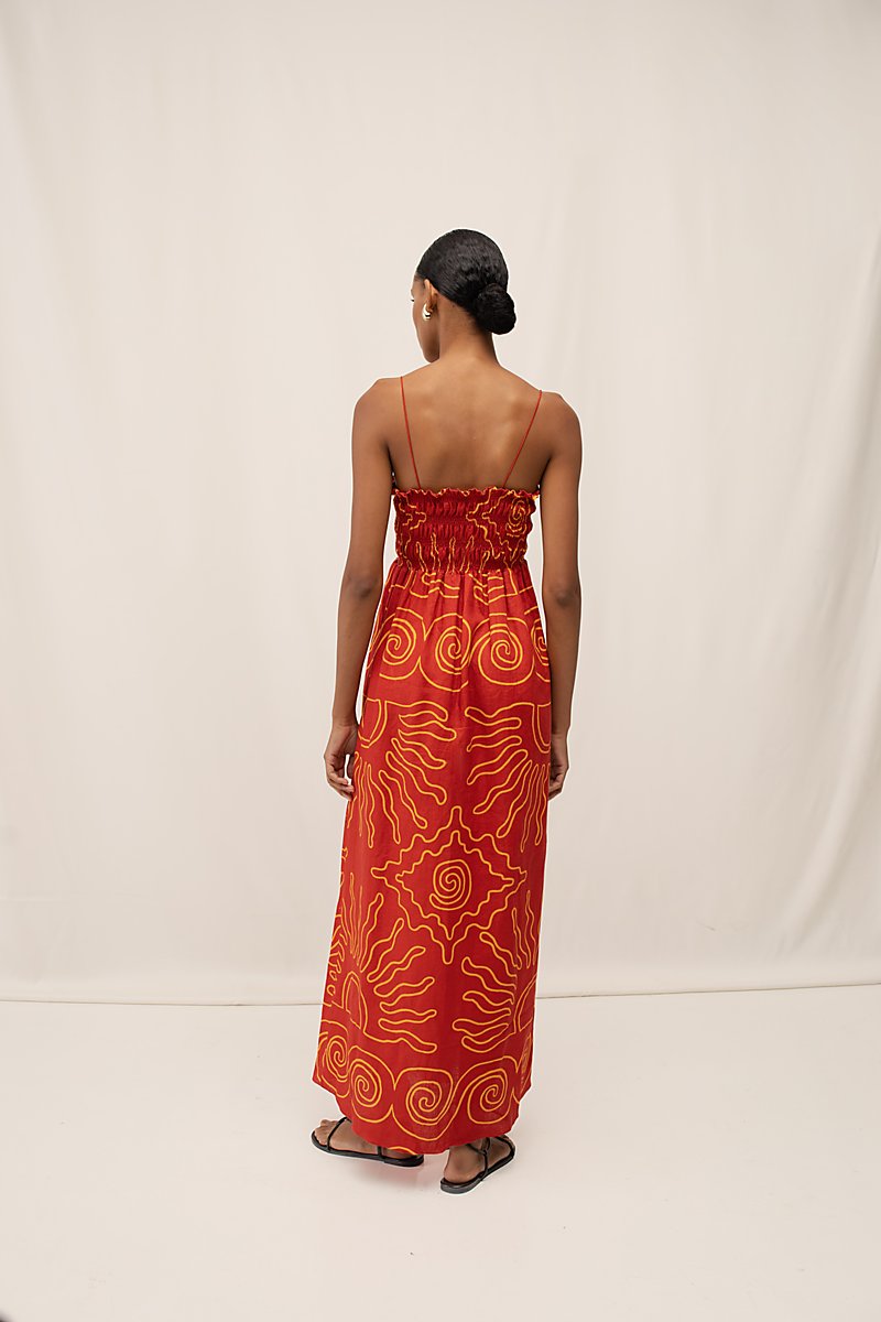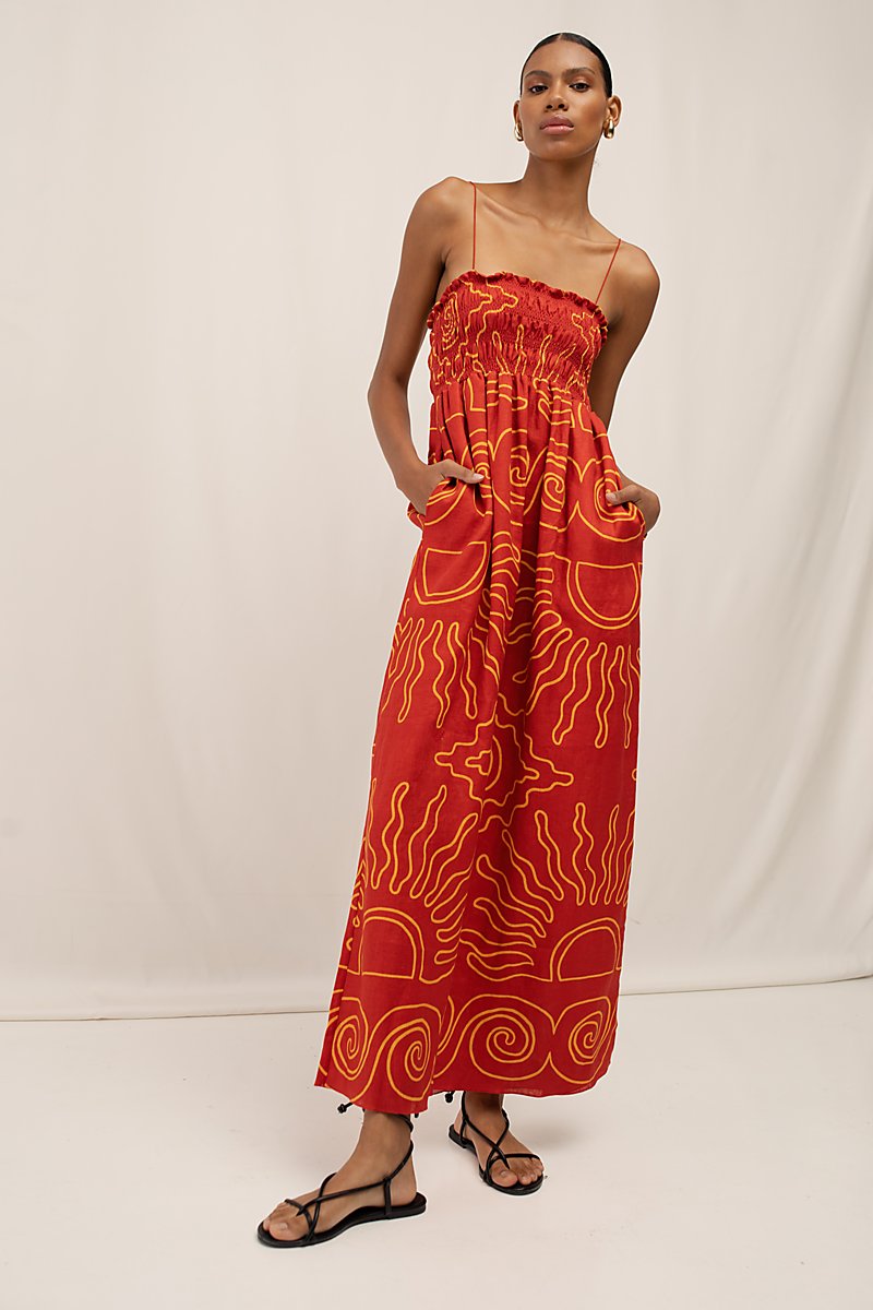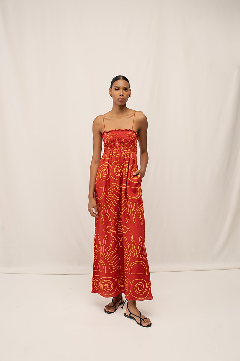 Vestido con corte en A con tiras elásticas y top recogido. Hecho de 100% lino.