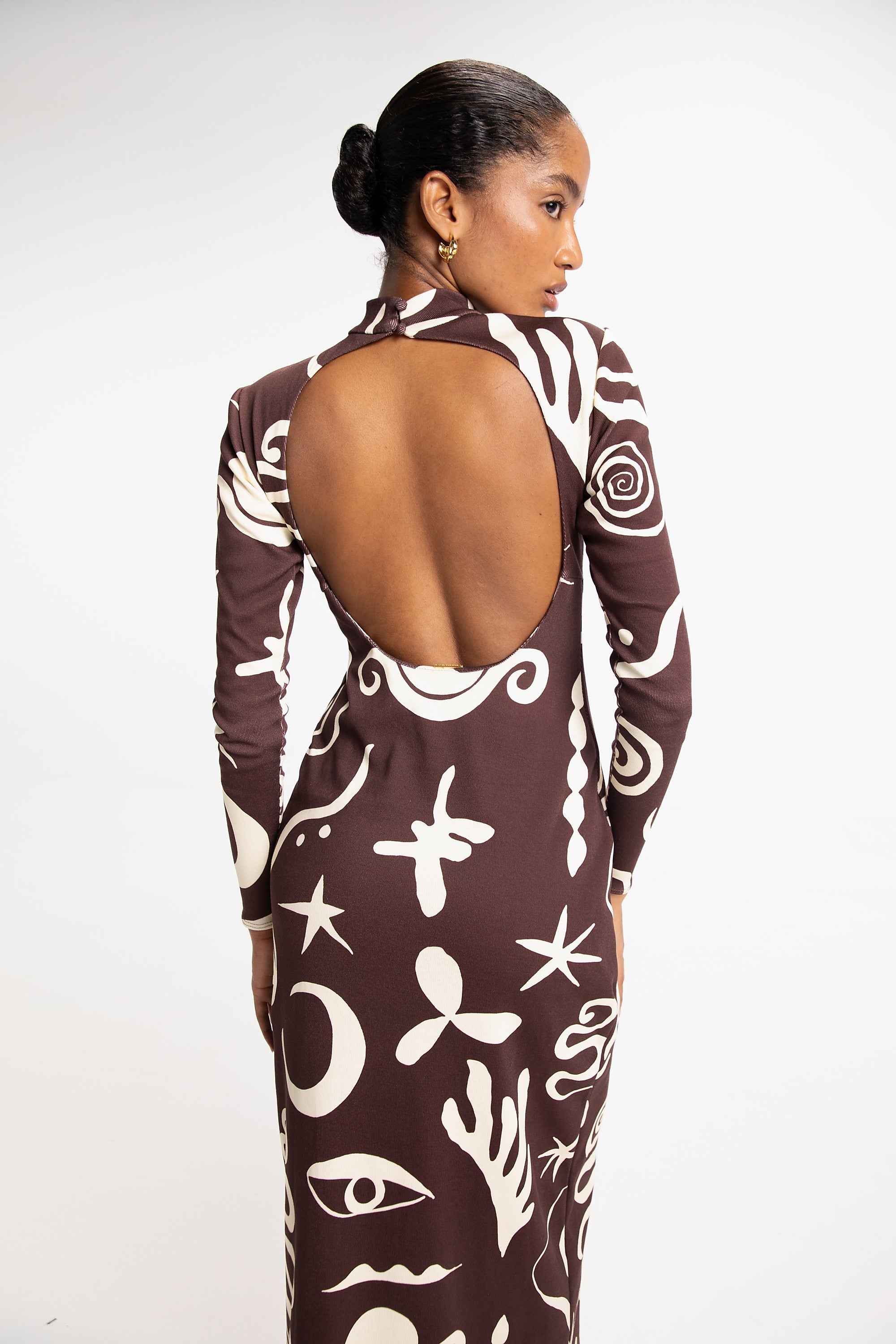 Vestido largo de cuello alto con espalda redonda descubierta. Hecho de 100% Algodon Orgánico.