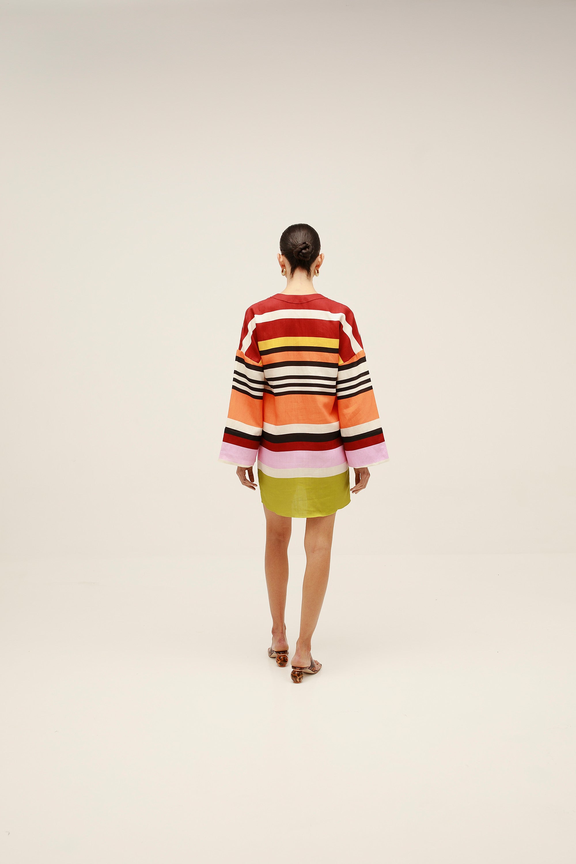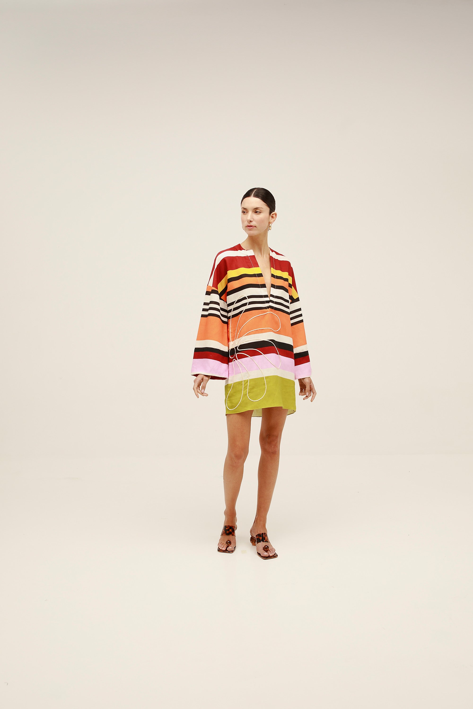 Vestido mini tipo túnica con mangas largas estilo kimono y escote en V profundo. Hecho de 100% lino.