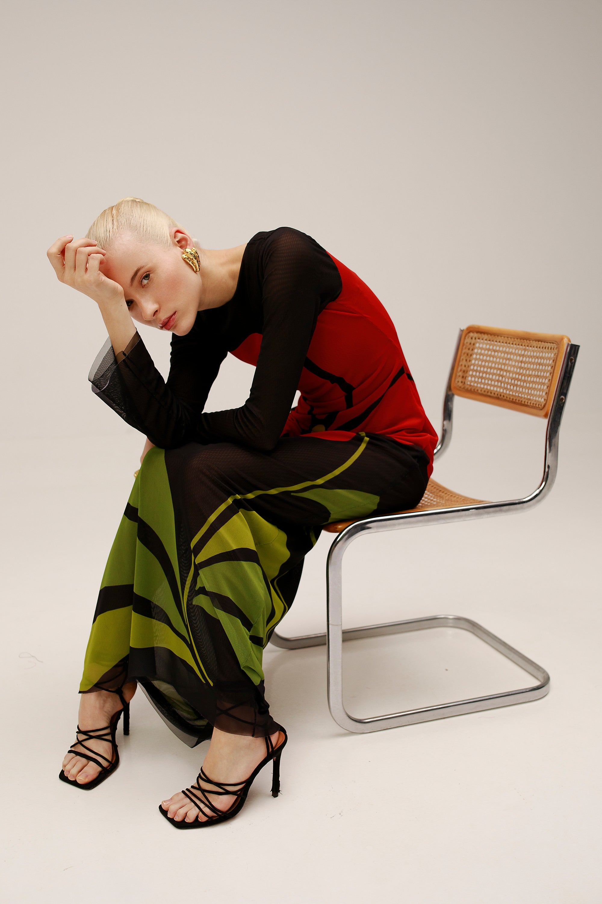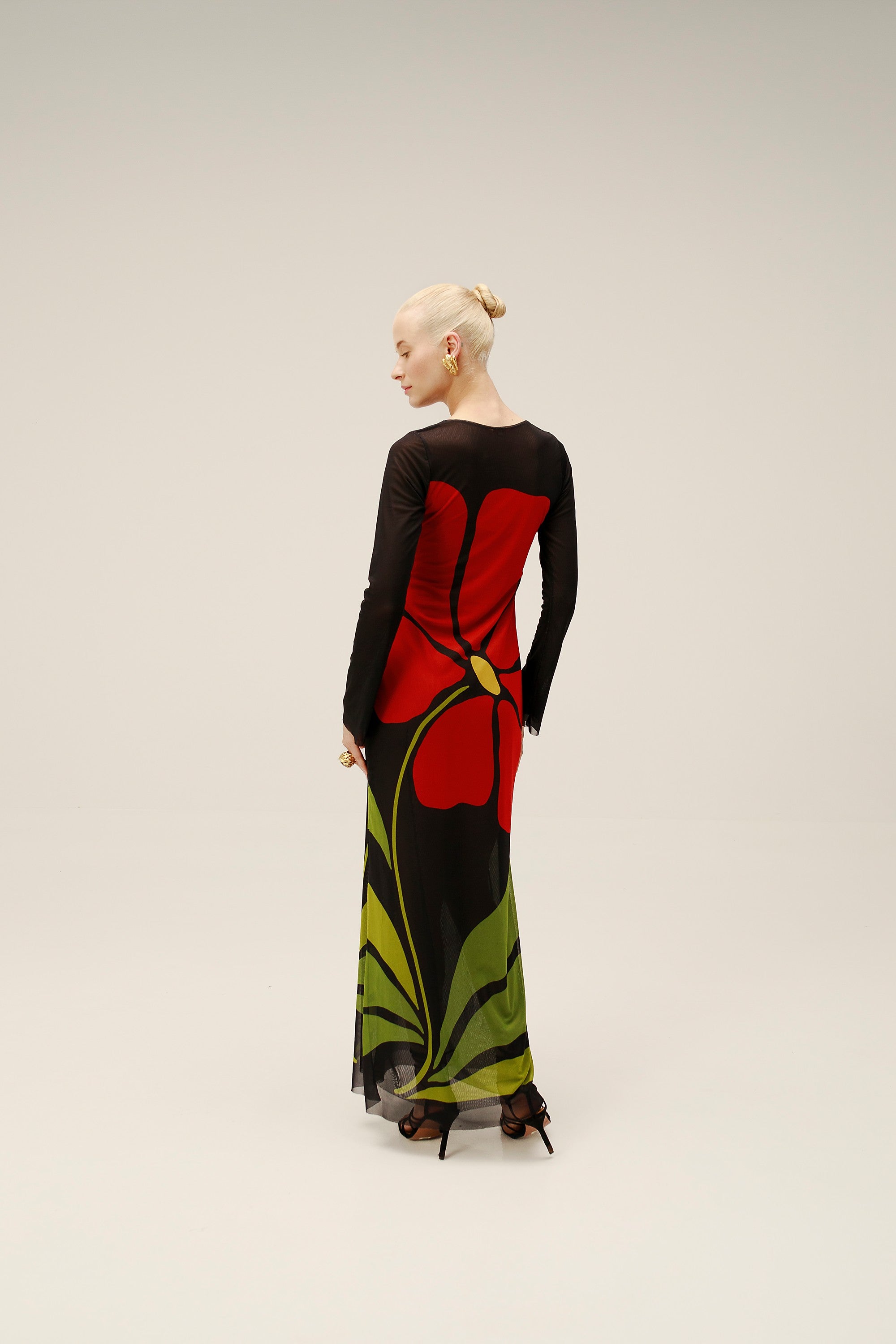 Vestido midi con transparencia, manga larga y escote redondo. Completamente forrado. Hecho de 50% poliéster reciclado, 44% poliéster, 6% elastano