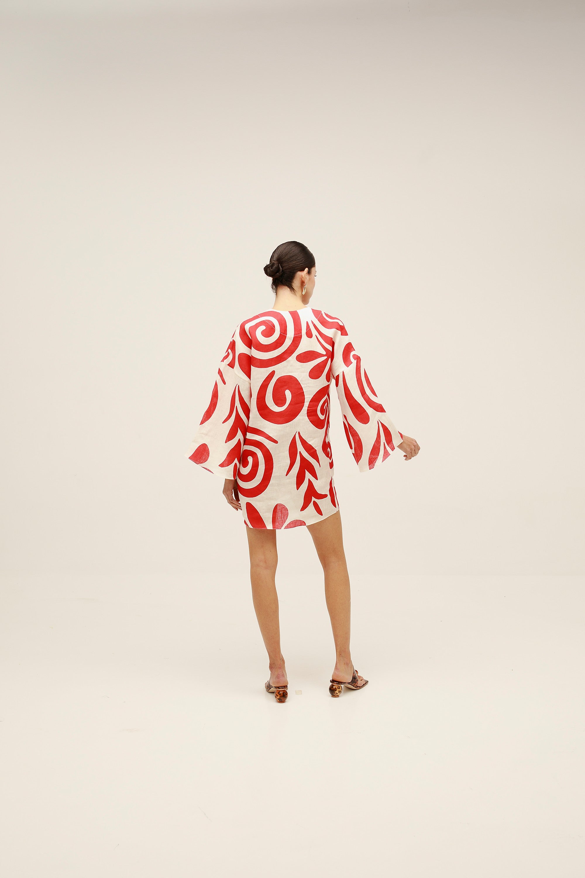 Vestido mini tipo túnica sin forro, con mangas largas estilo kimono y escote en V profundo. Hecho de 100% lino.