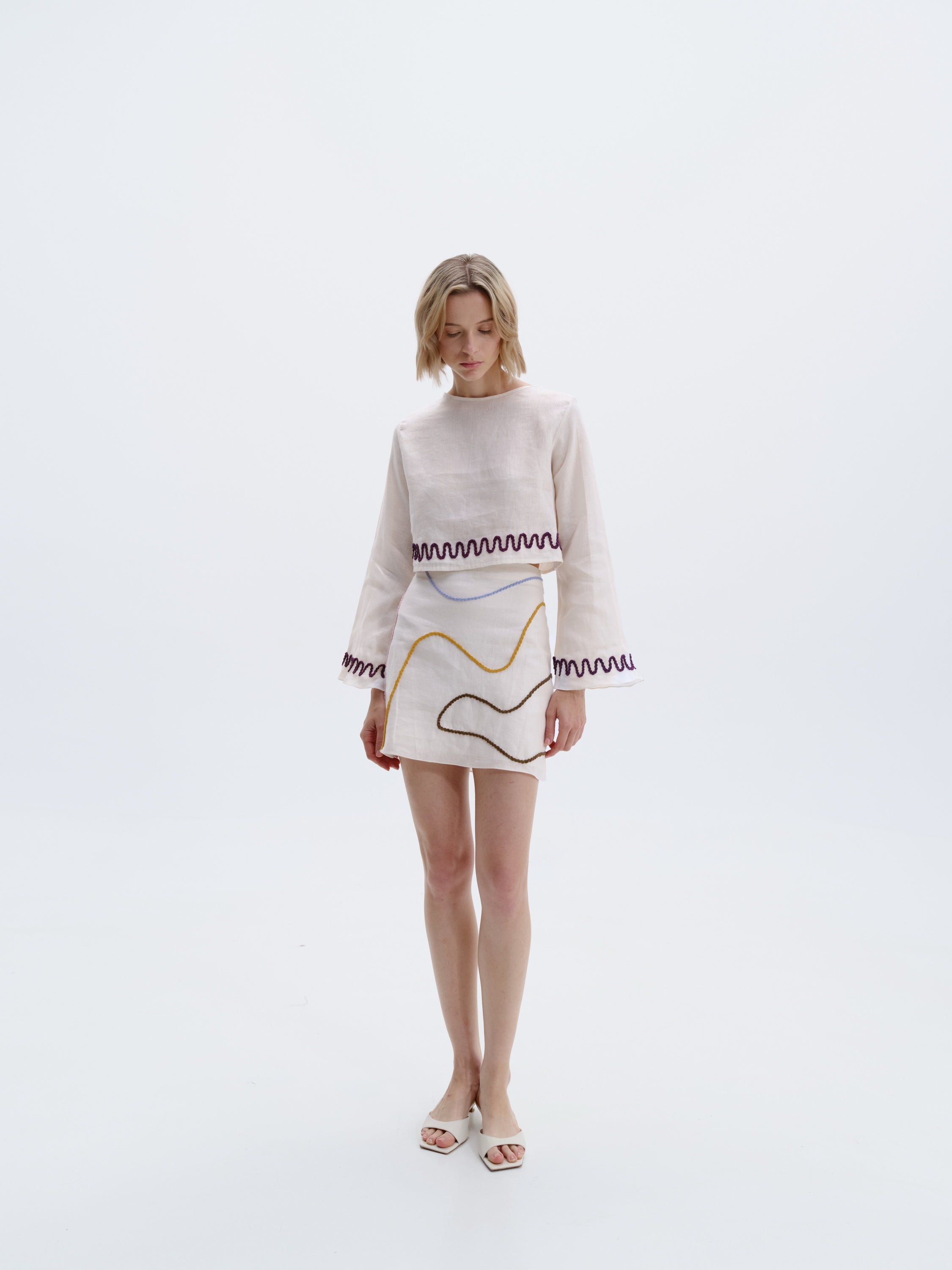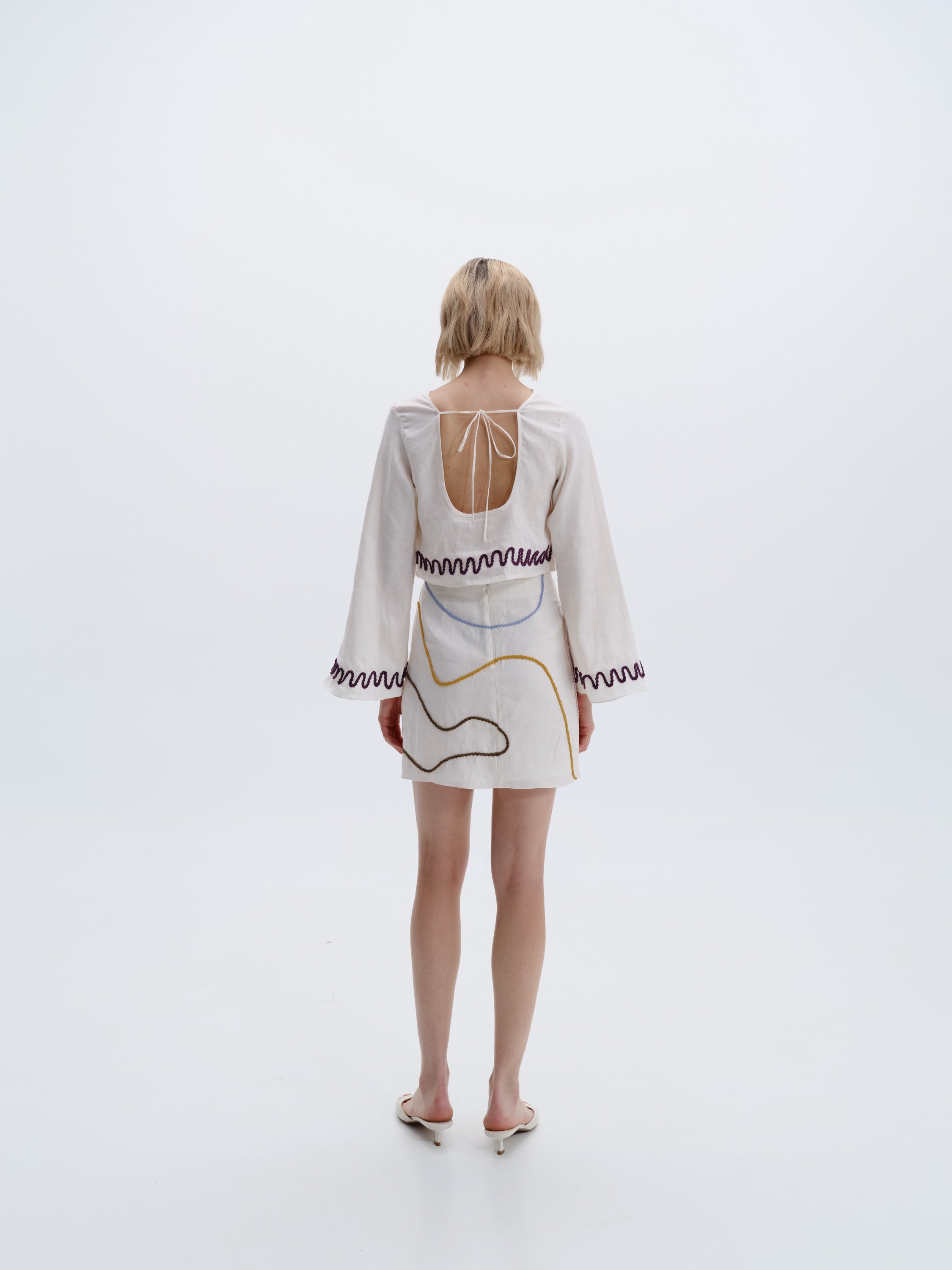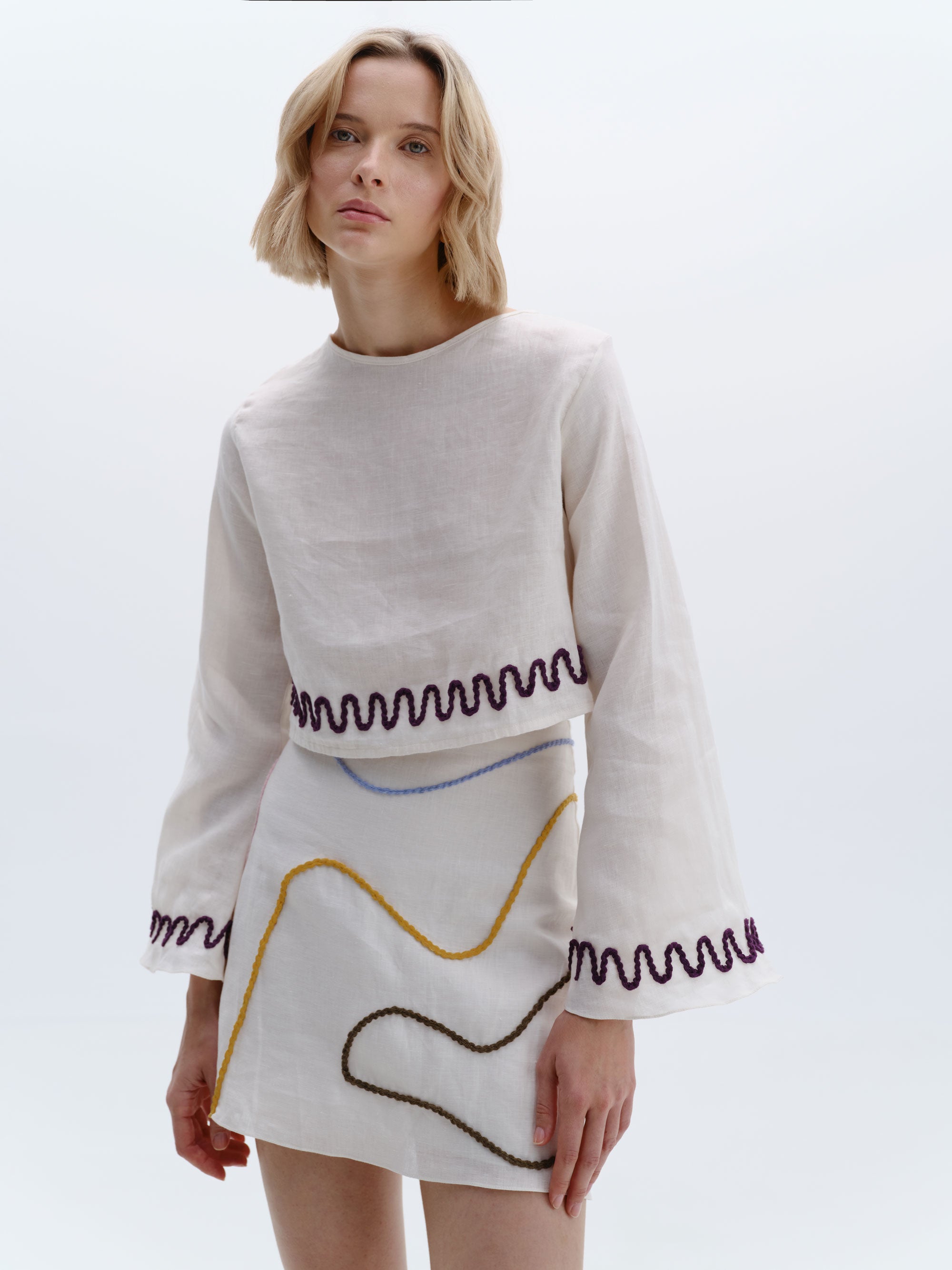 Top corto de mangas largas estilo kimono y espalda abierta con bordado hecho a mano en el dobladillo. Hecho de 100% lino.