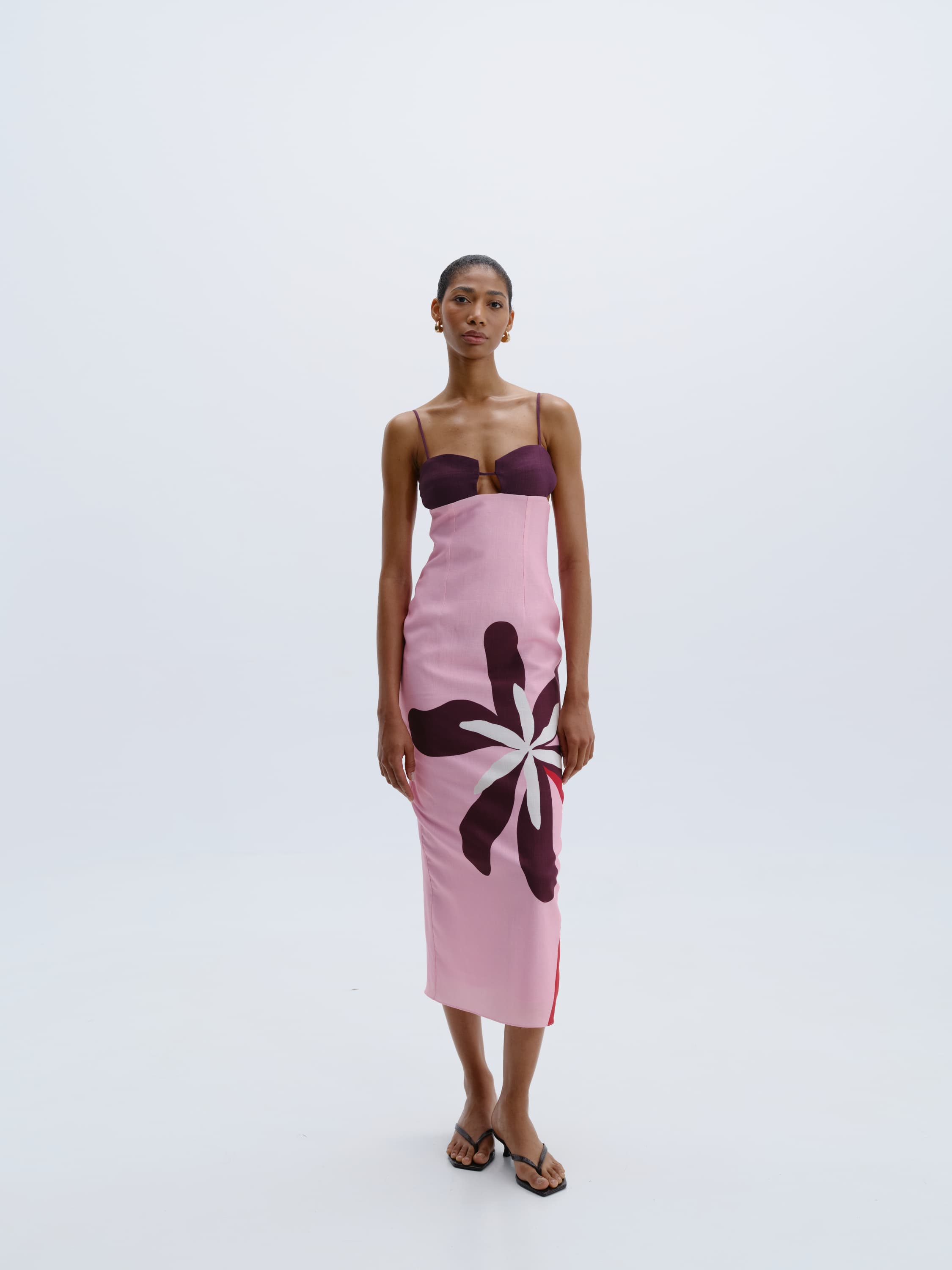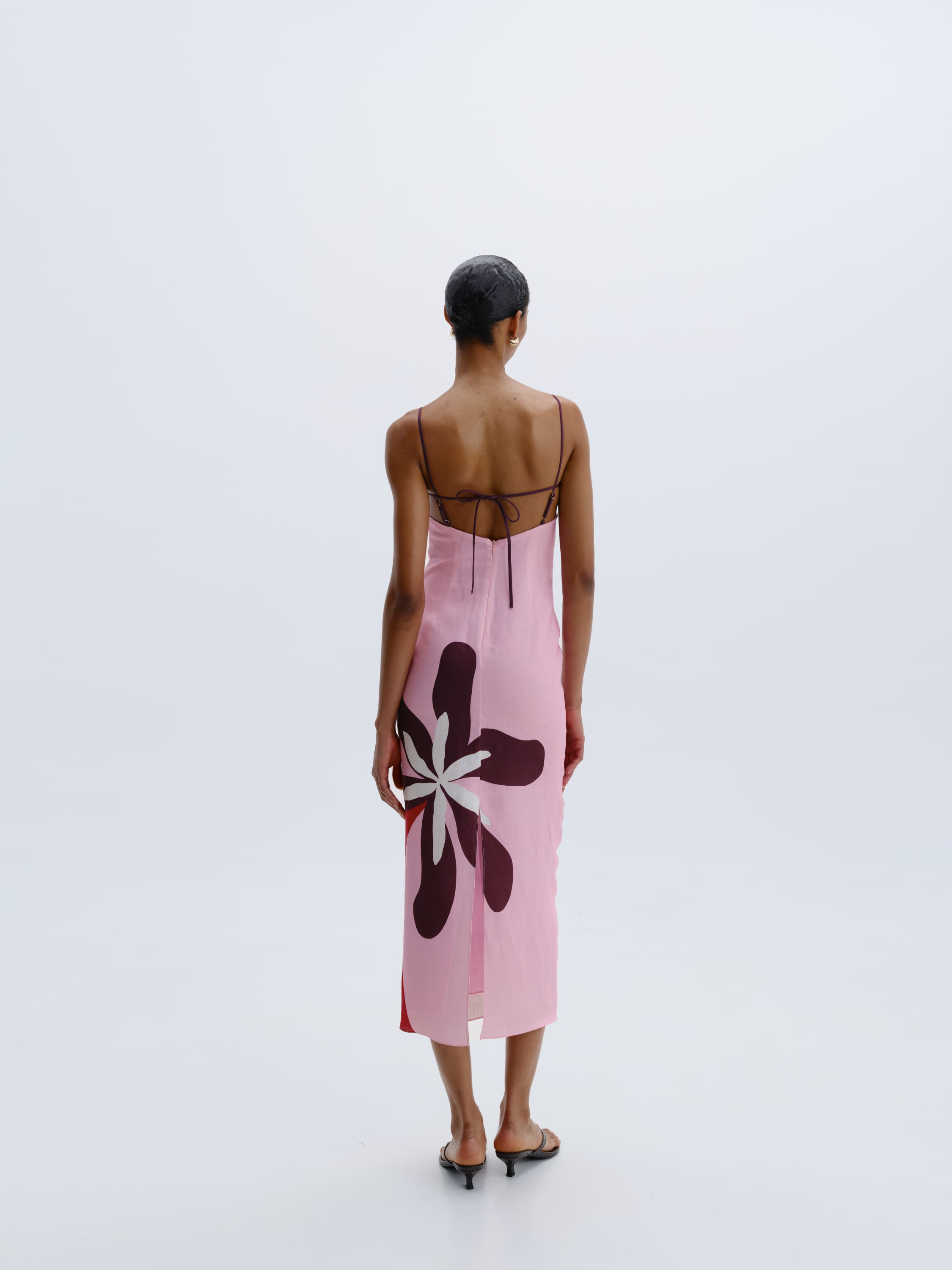Vestido midi con top ajustado, falda recta y tiras delicadas. Totalmente forrado. Hecho 100 % de Lino.
