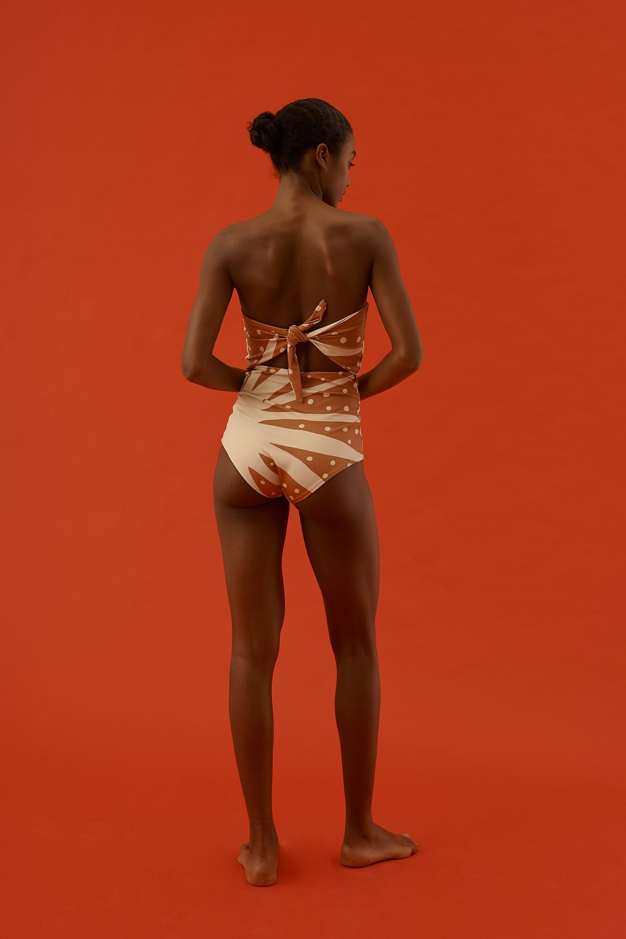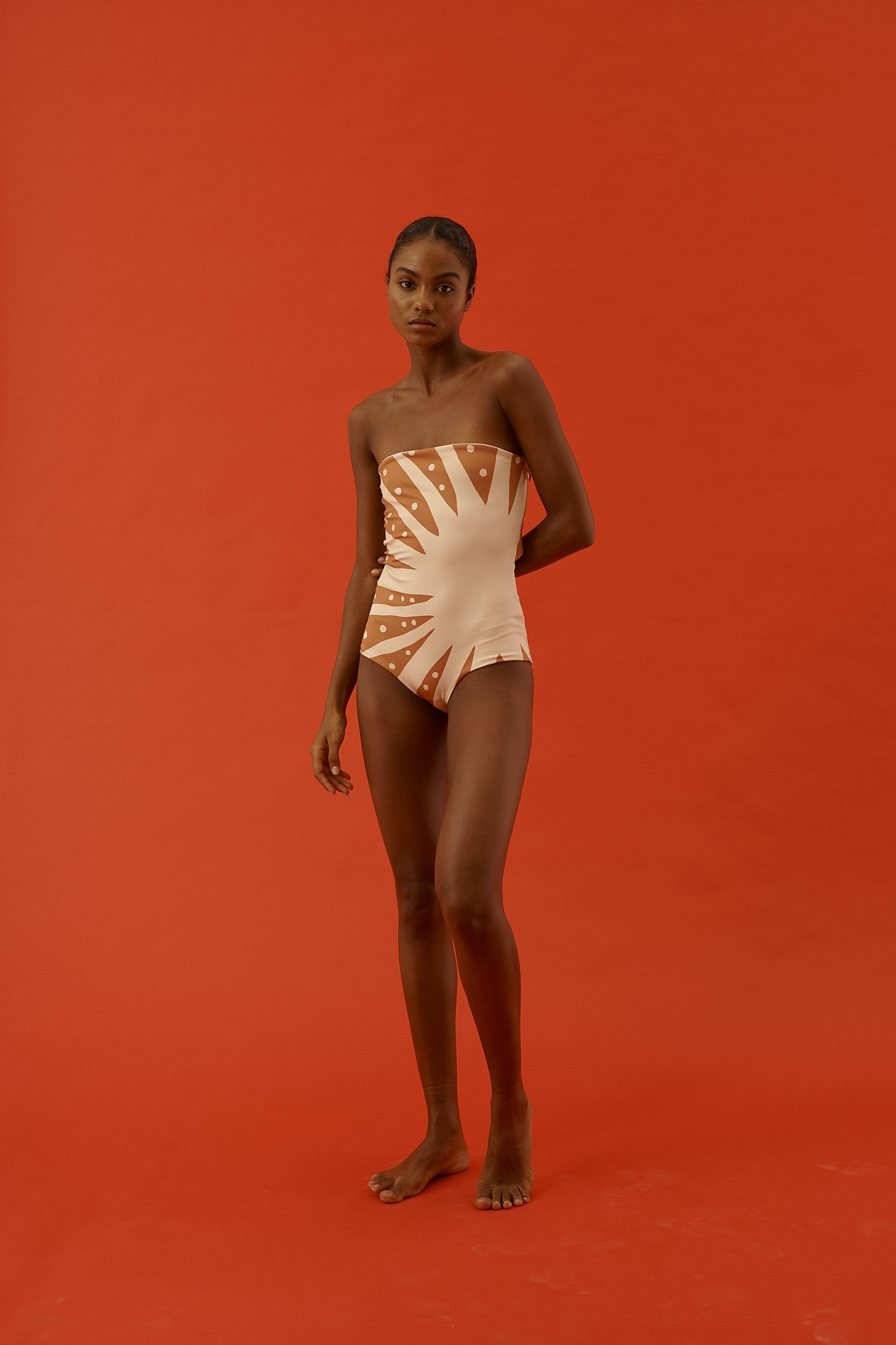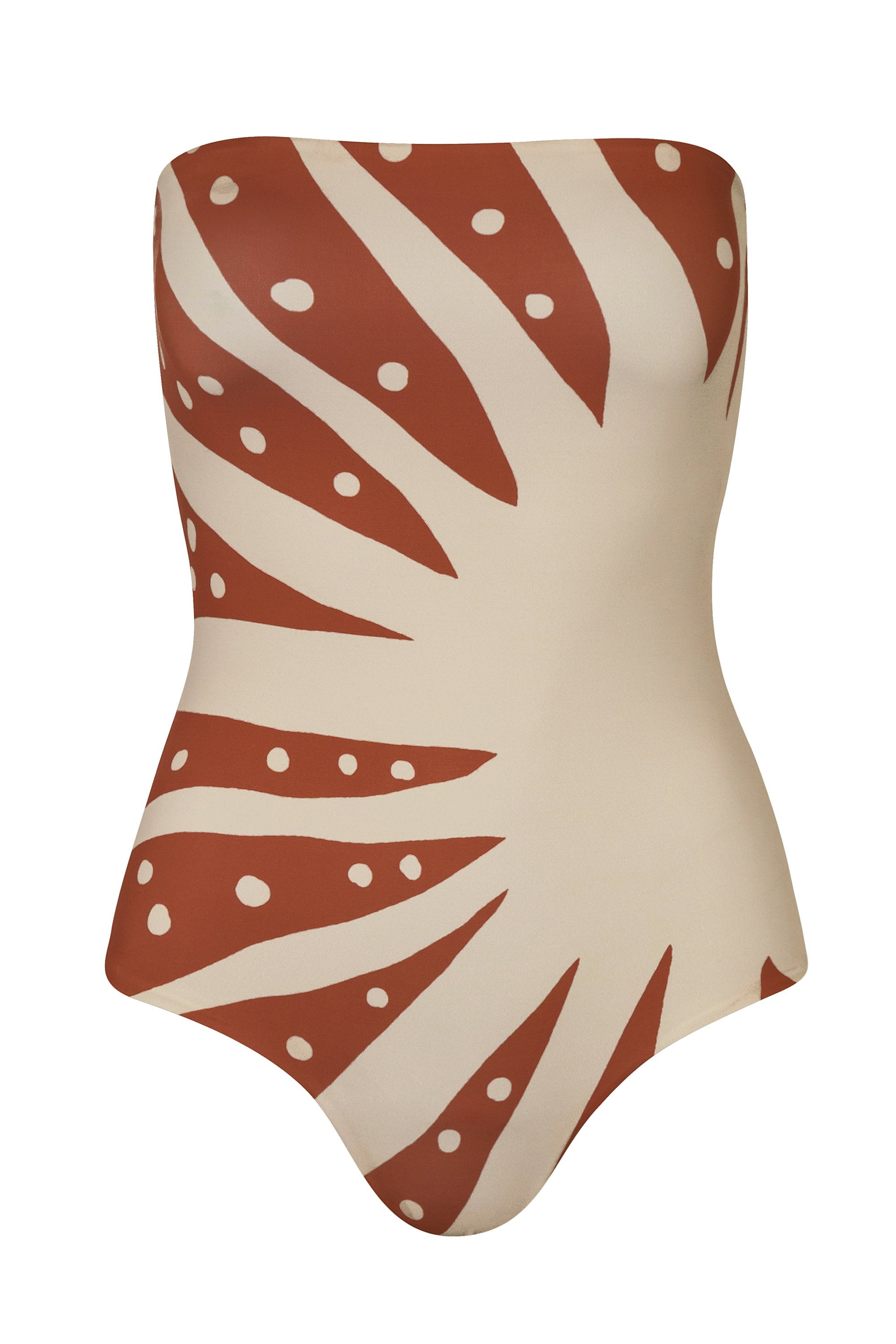 Enterizo de escote recto strapless totalmente forrado con lazo ajustable en la espalda. Hecho con poliamida reciclada| poliamida y elastano.