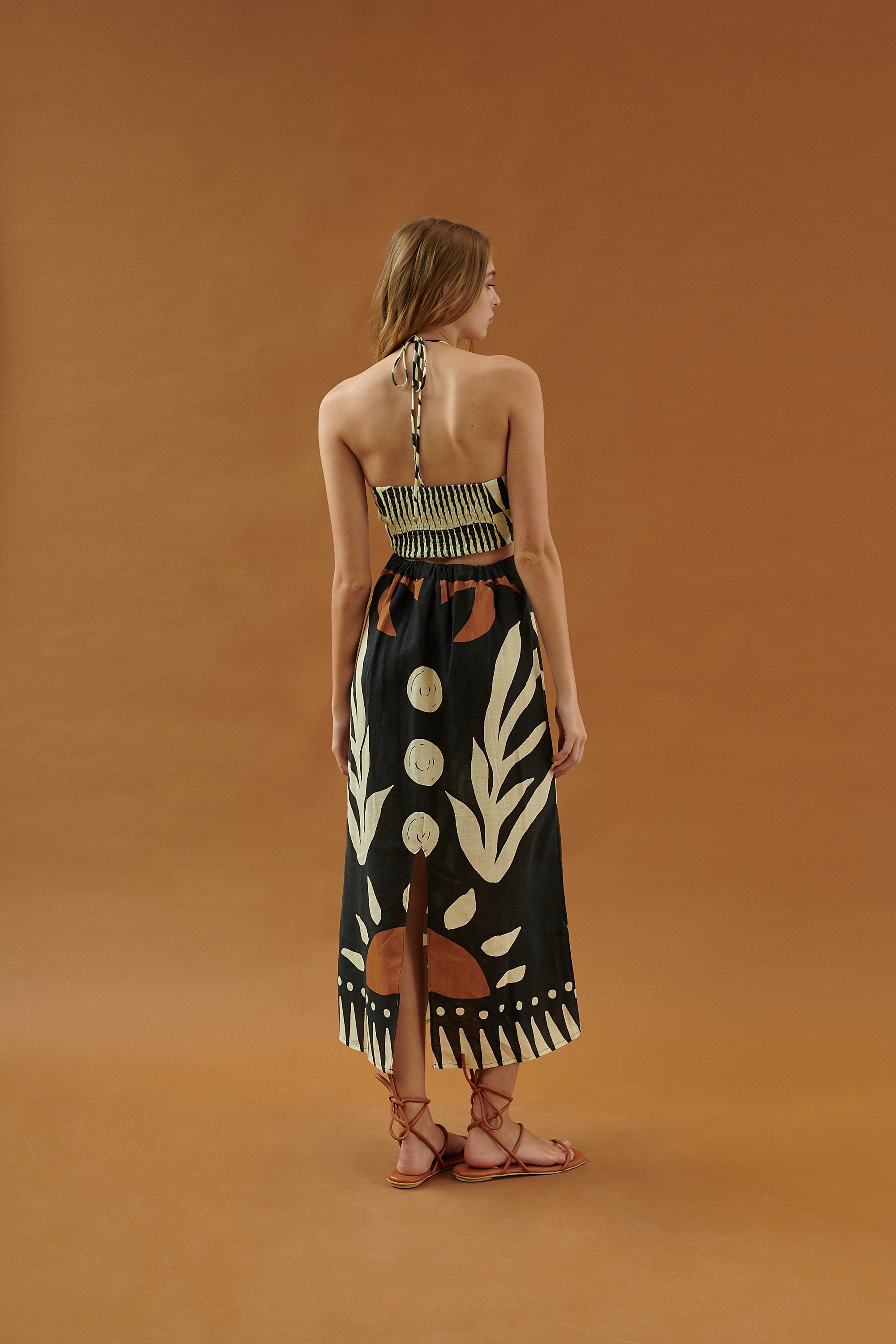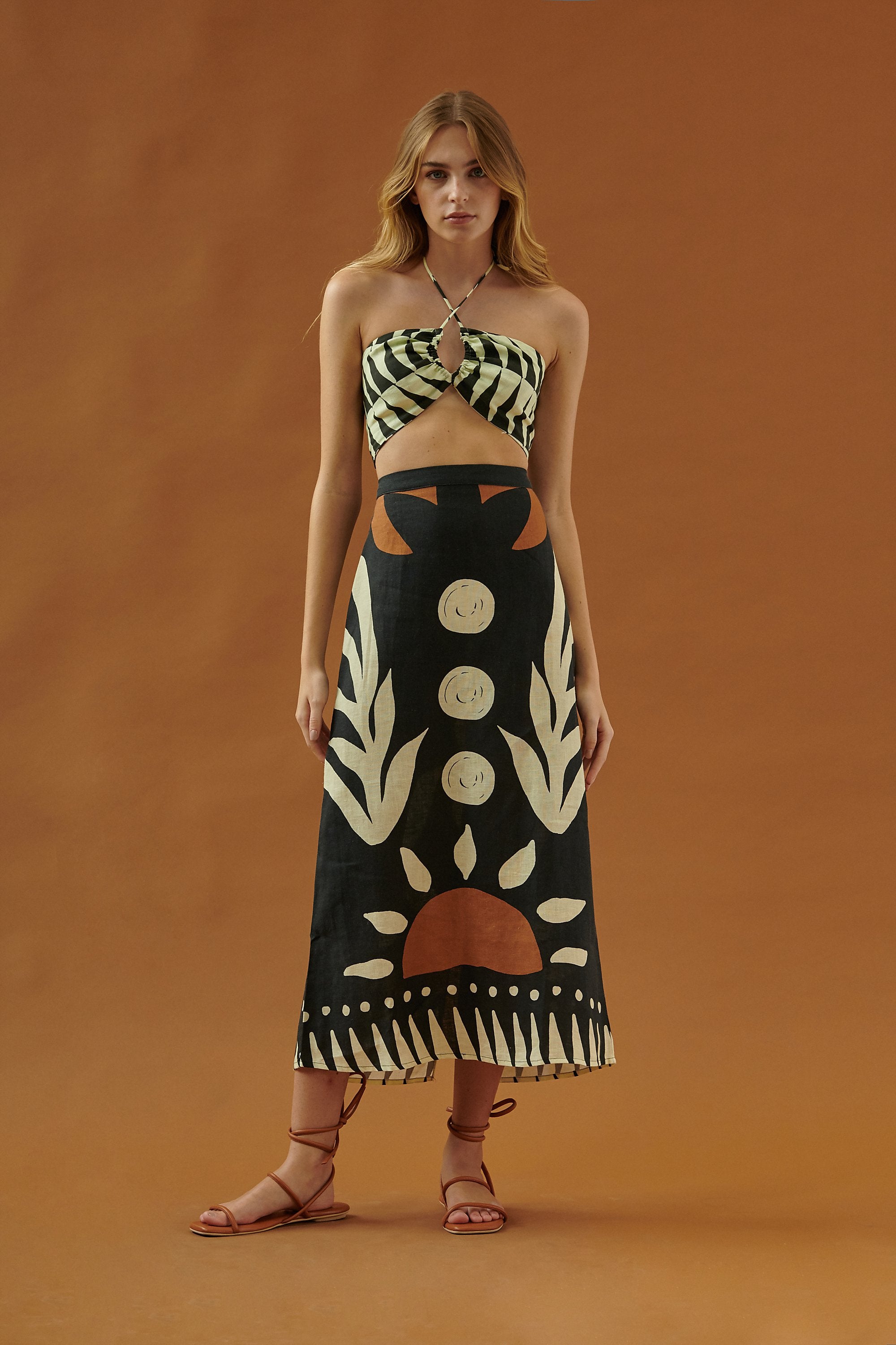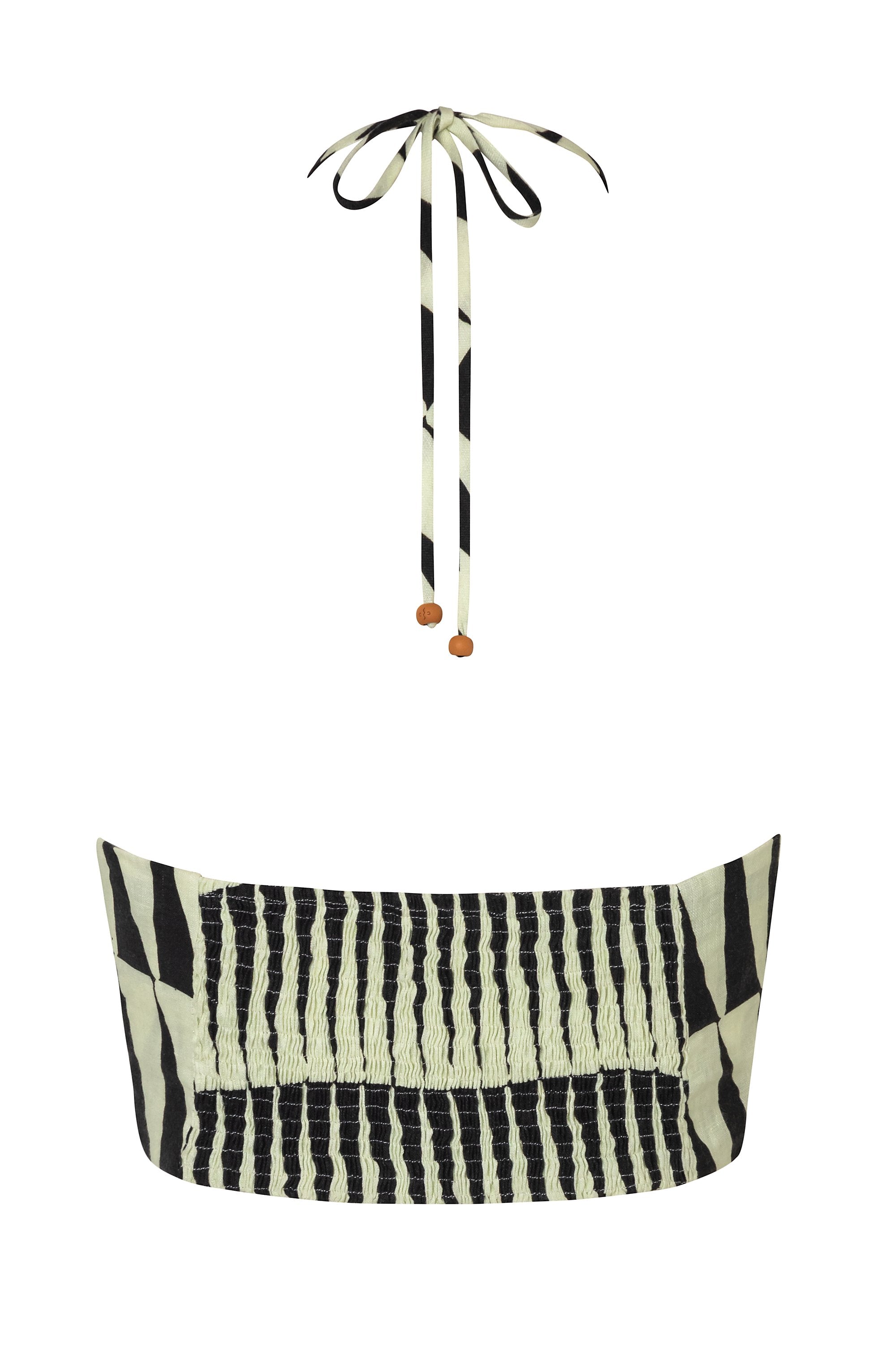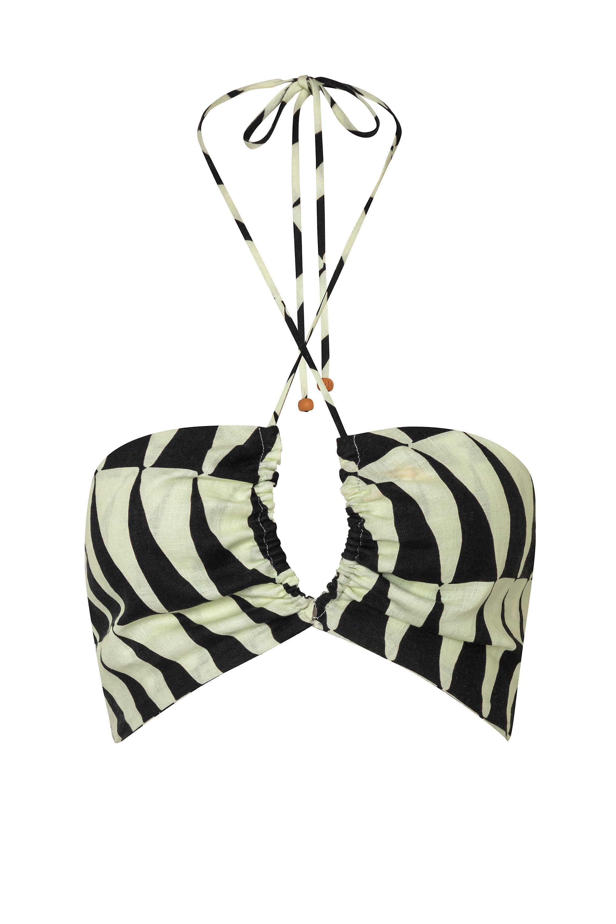 Top de cuello halter| totalmente forrado| con tirantes cruzados y abertura frontal en forma de lágrima. Hecho de 100% lino.