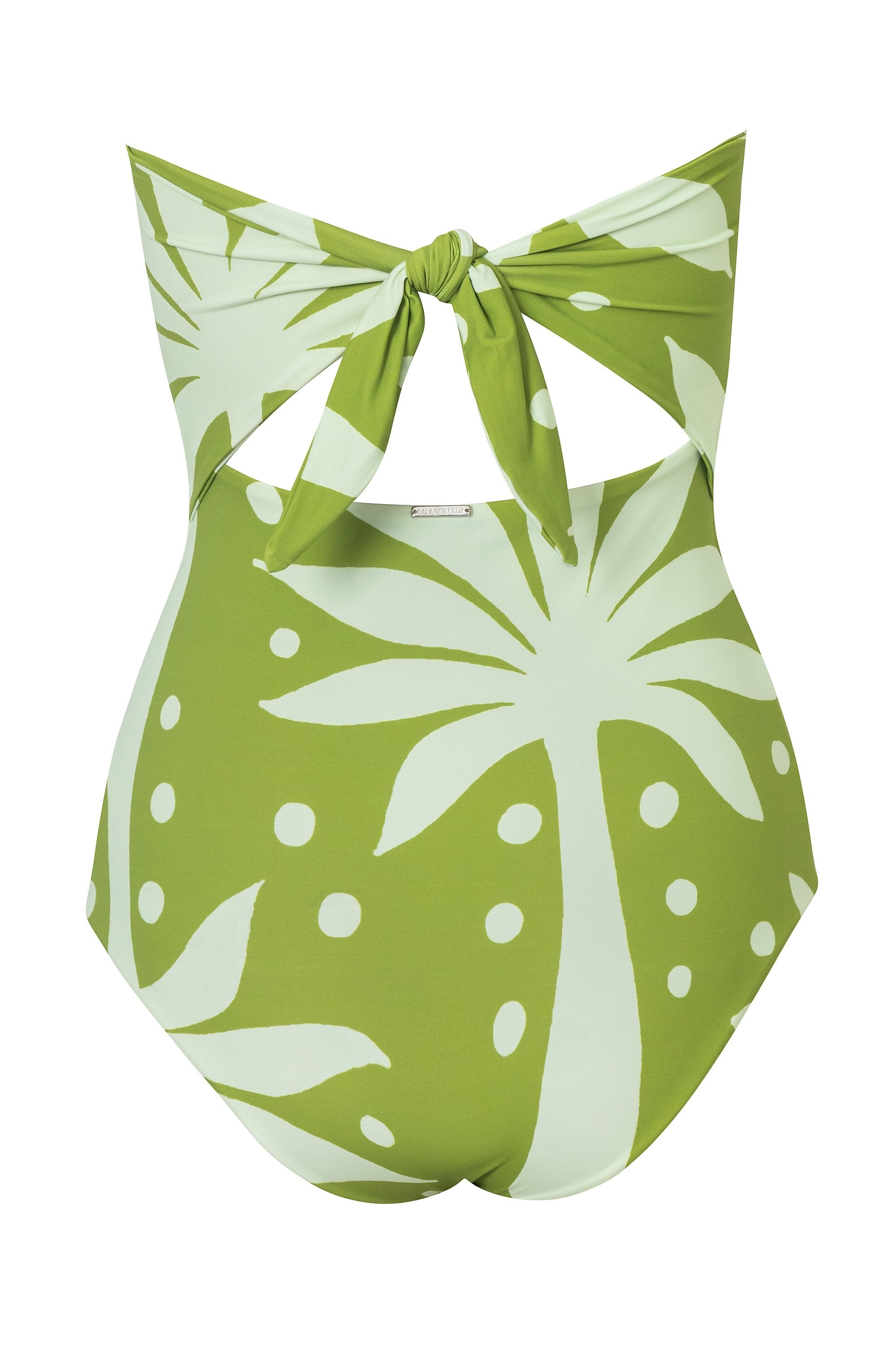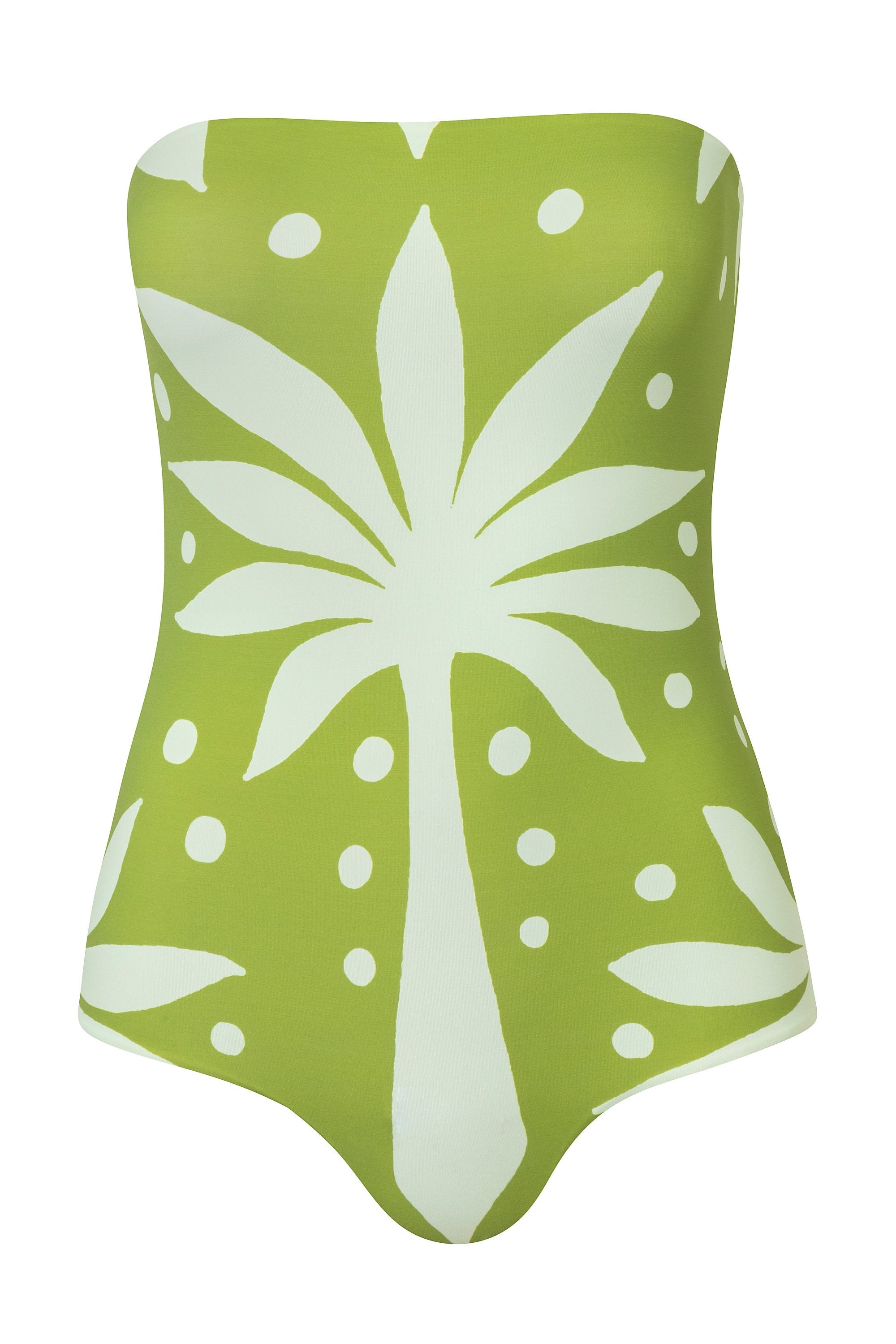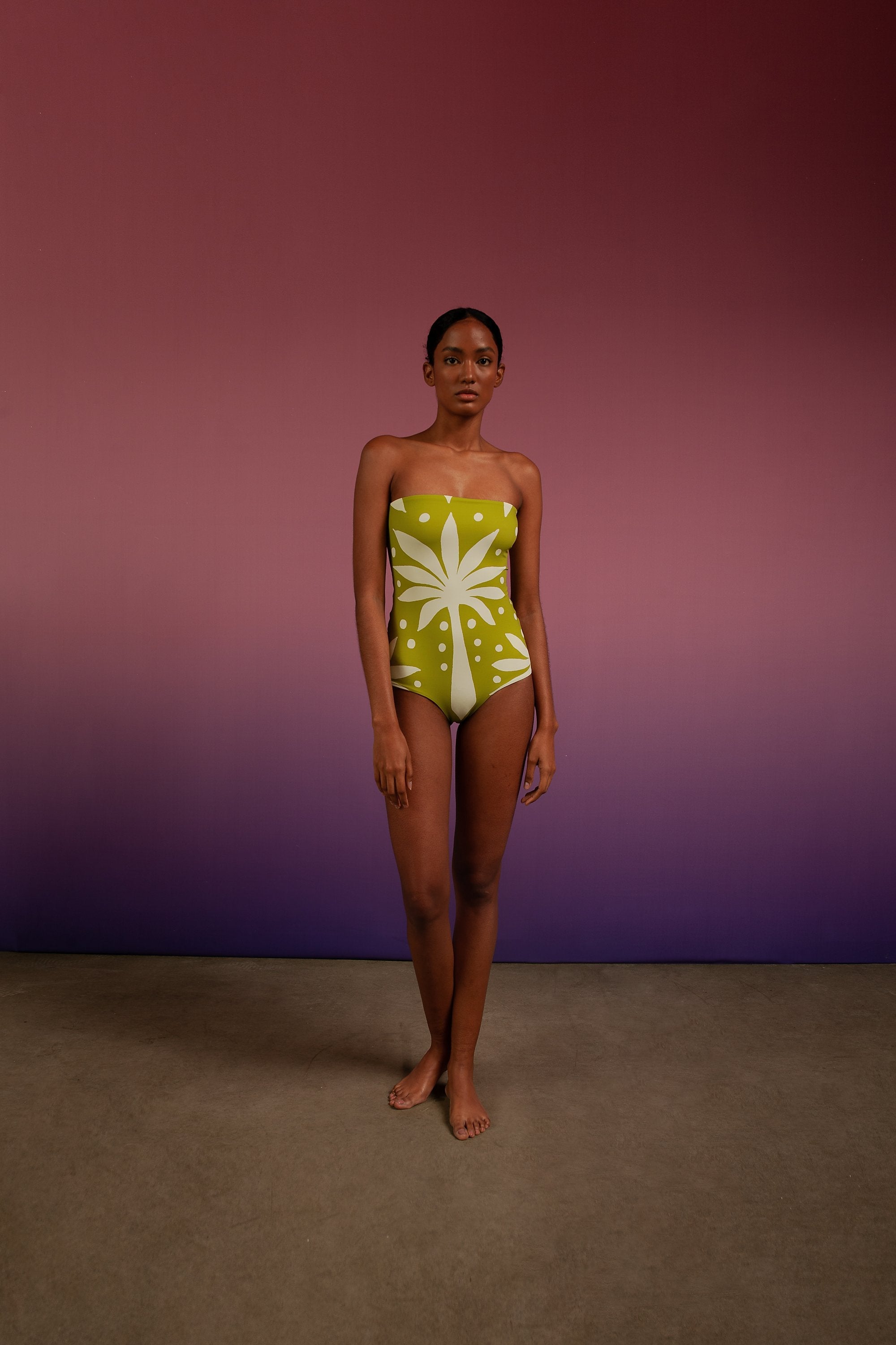 Enterizo de escote recto strapless totalmente forrado con lazo ajustable en la espalda. Hecho con poliamida reciclada, poliamida y elastano.