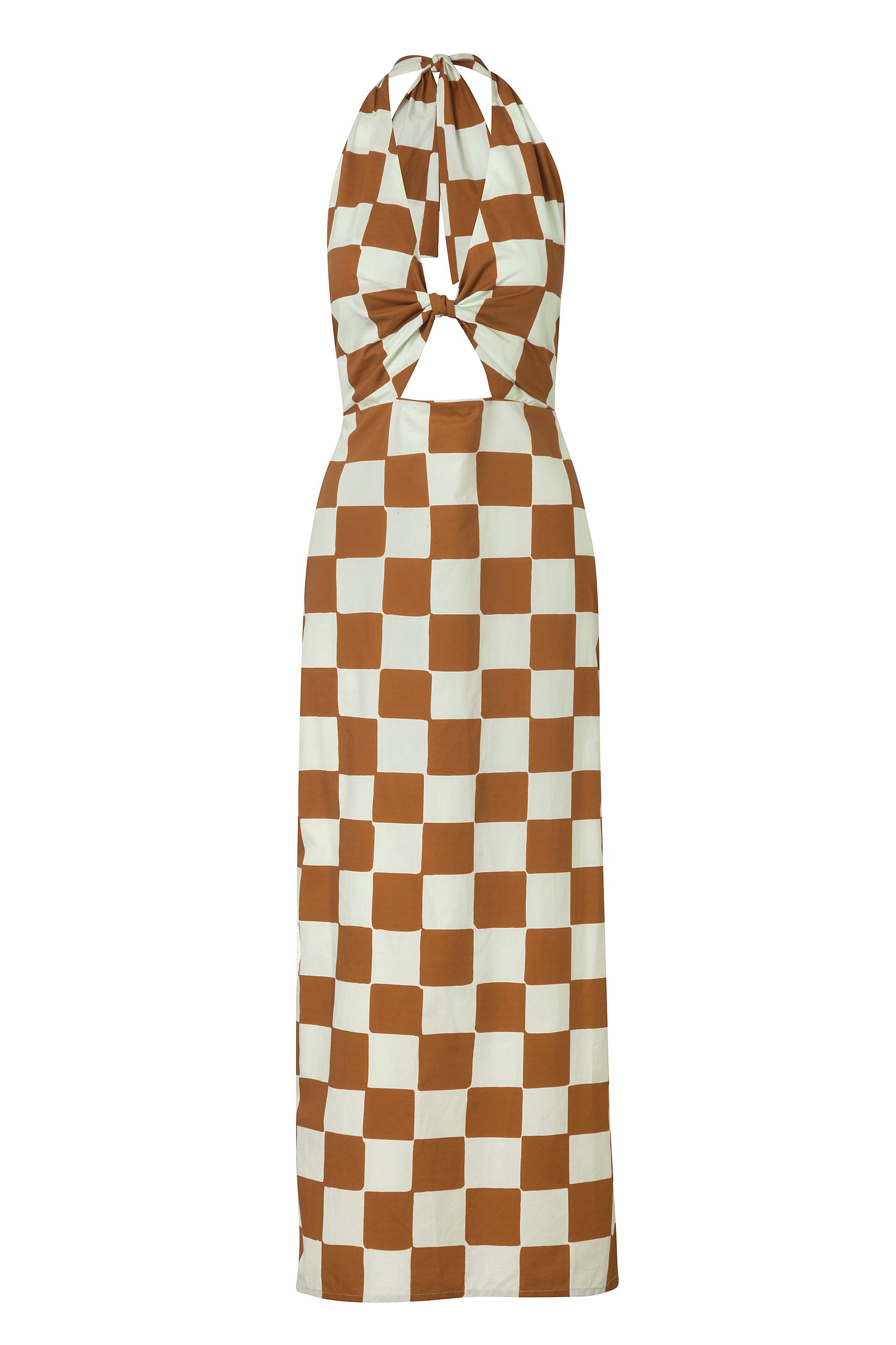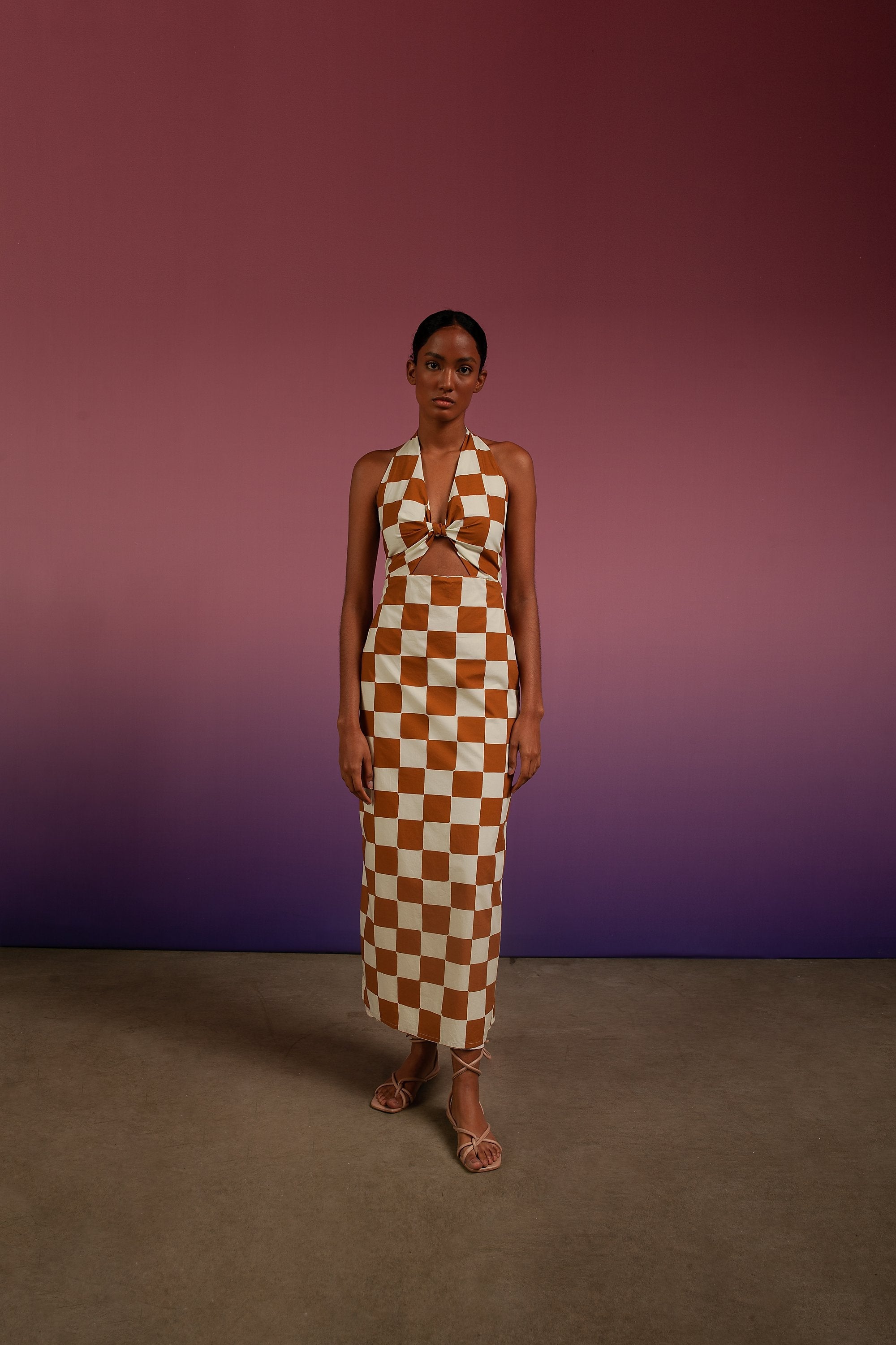 Vestio midi estilo halter con escote en V pronunciado. Detalle de nudo y abertura en la parte delantera. Hecho de 100% Lino.