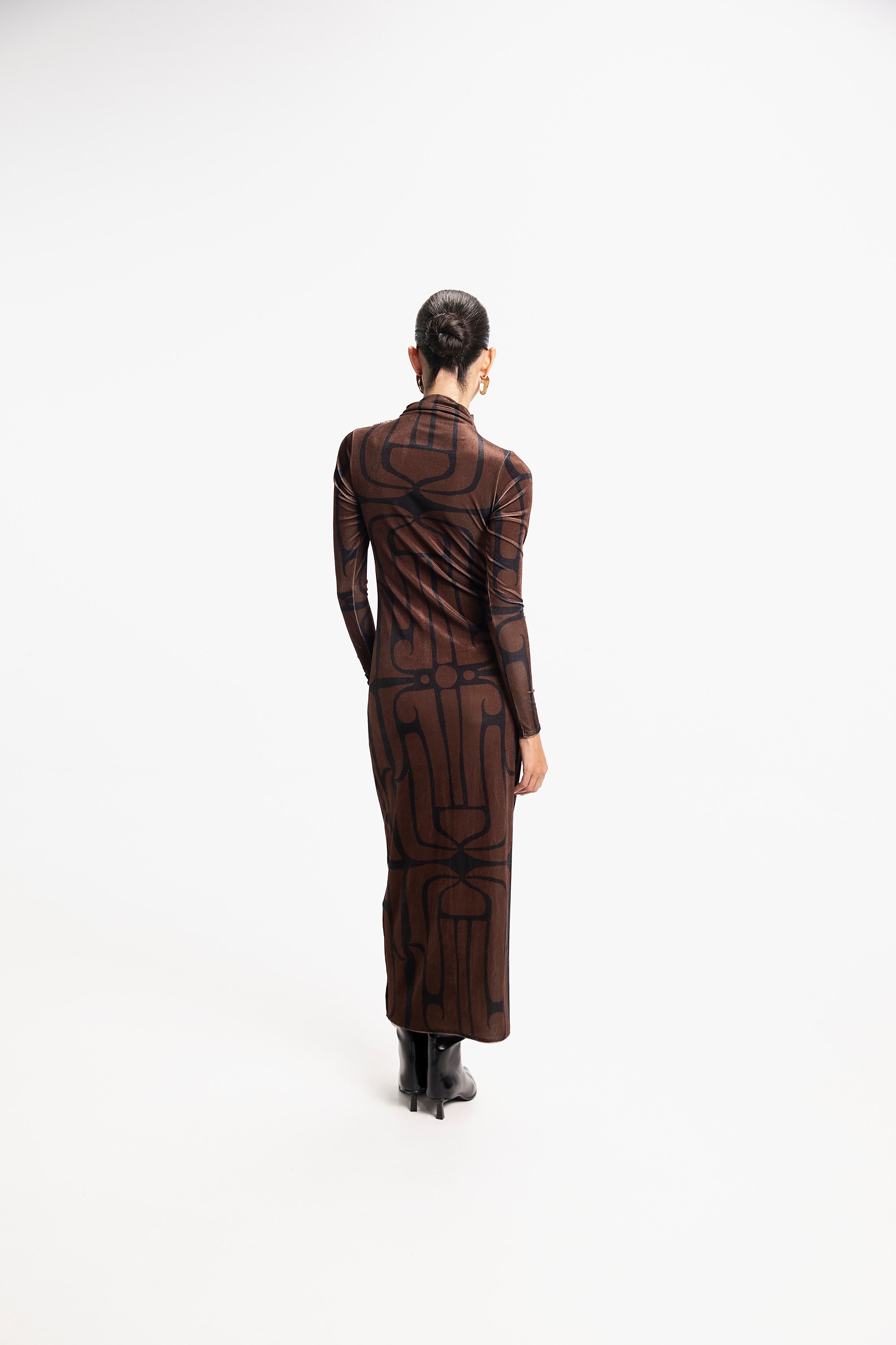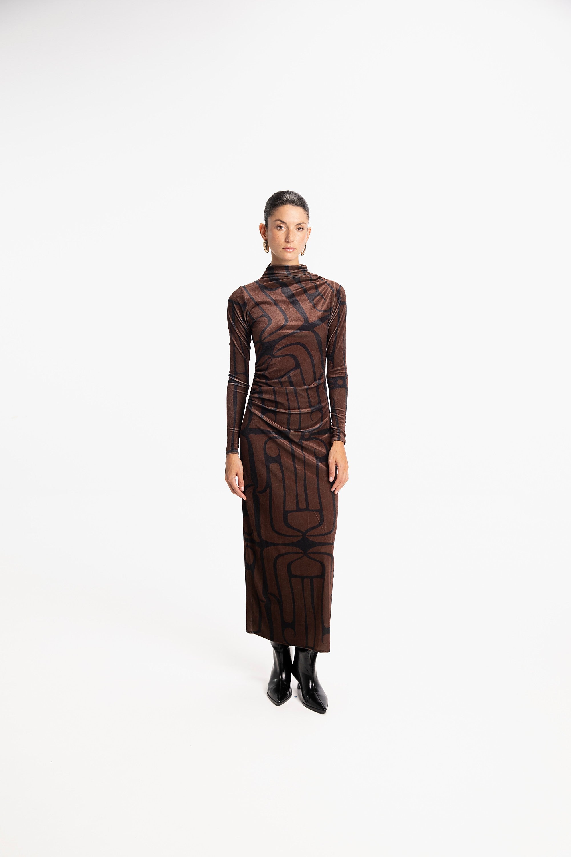 Vestido de terciopelo con mangas largas con cuello tortuga y recogido en el costado y el hombro. Hecho de 95% Poliester 5% Elastano.