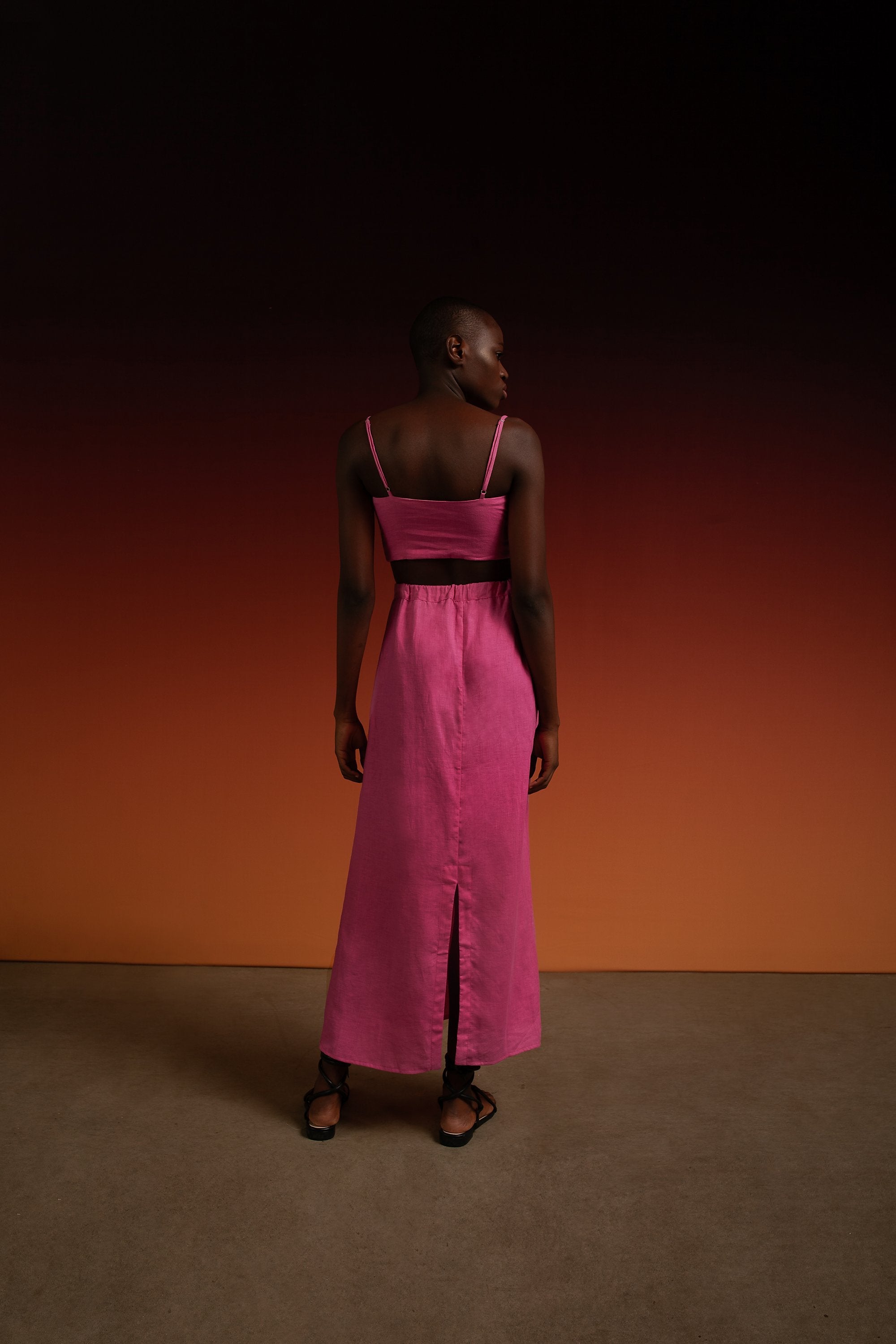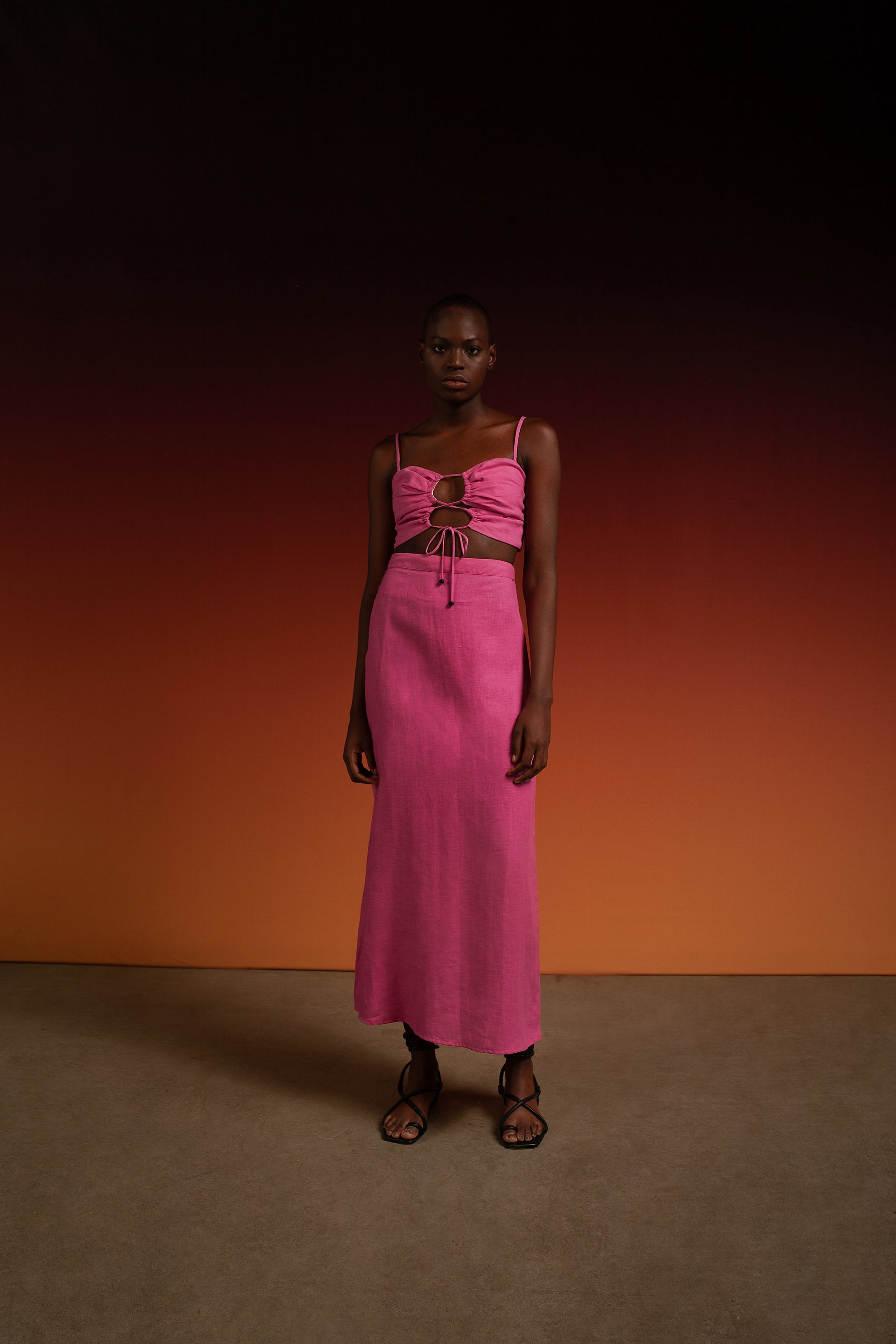 Crop top totalmente forrado con tirantes estilo spaghetti y abertura frontal en forma de lágrima. Hecho de 100% lino.