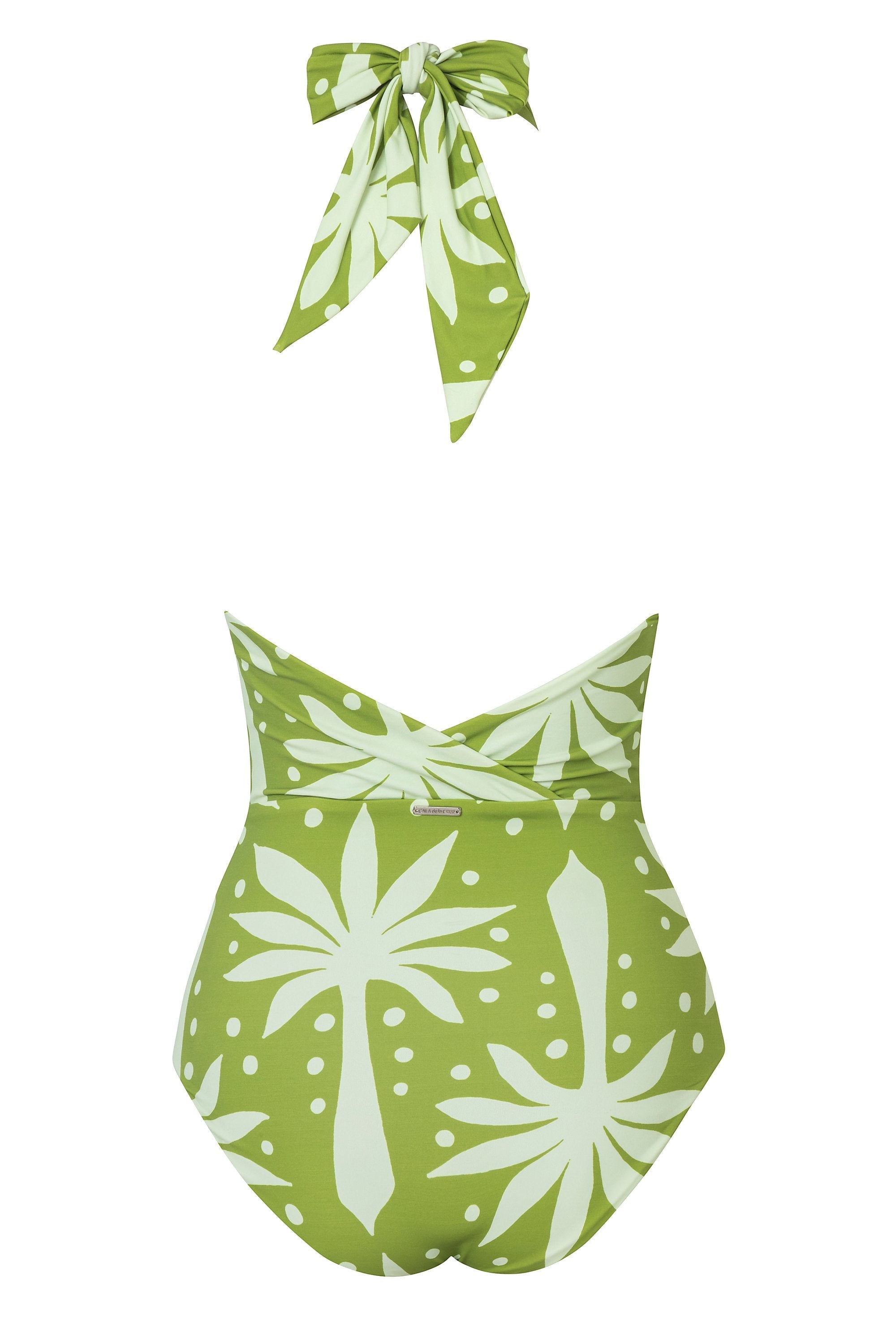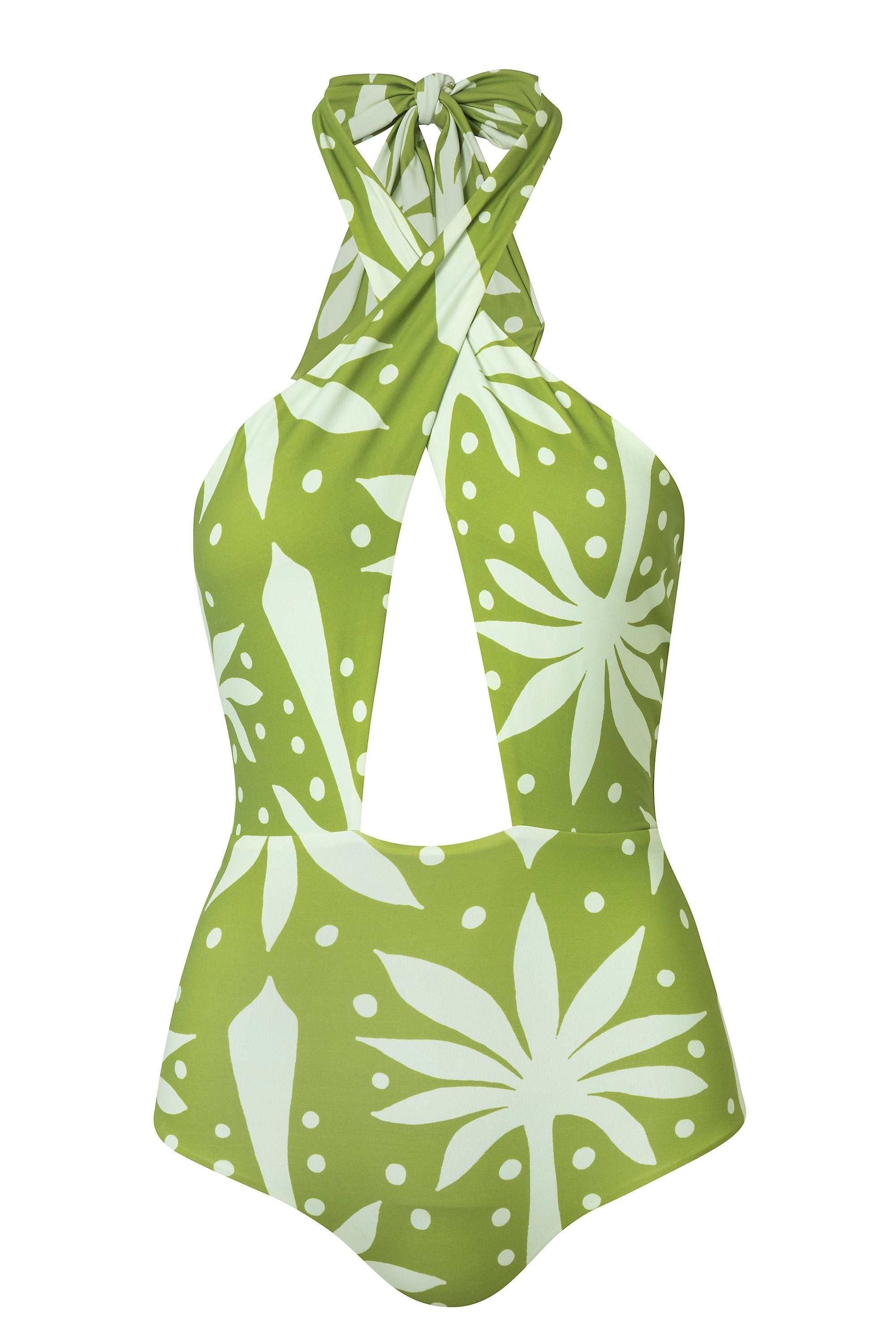 Enterizo escotado en la espalda totalmente forrado estilo halter con tiras ajustables entrelazadas y abertura frontal. Hecho con poliamida reciclada poliamida y elastano.
