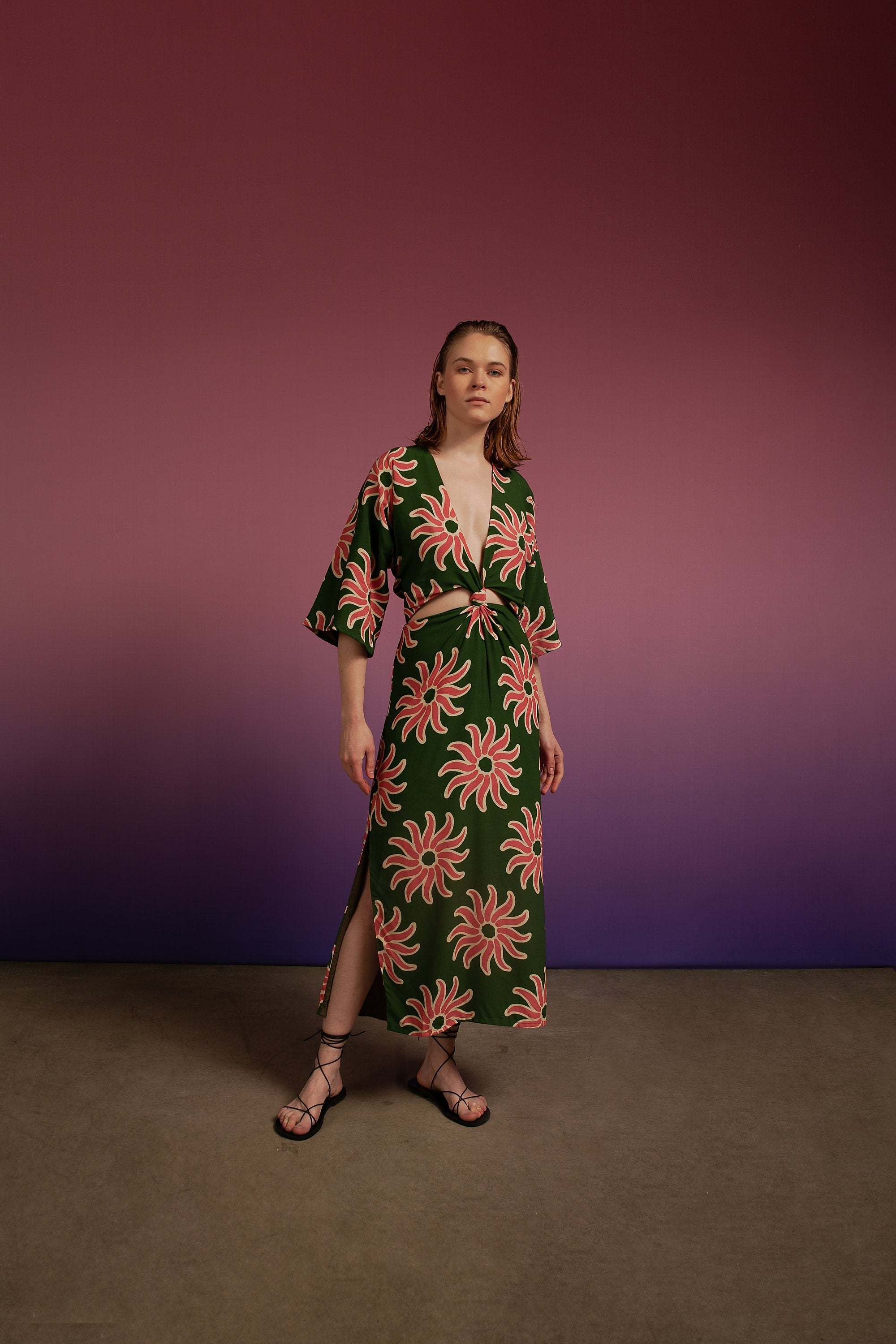 Vestido largo con escote en V pronunciado y aberturas laterales. Top forrado y mangas oversized. Hecho de 100% algodon.