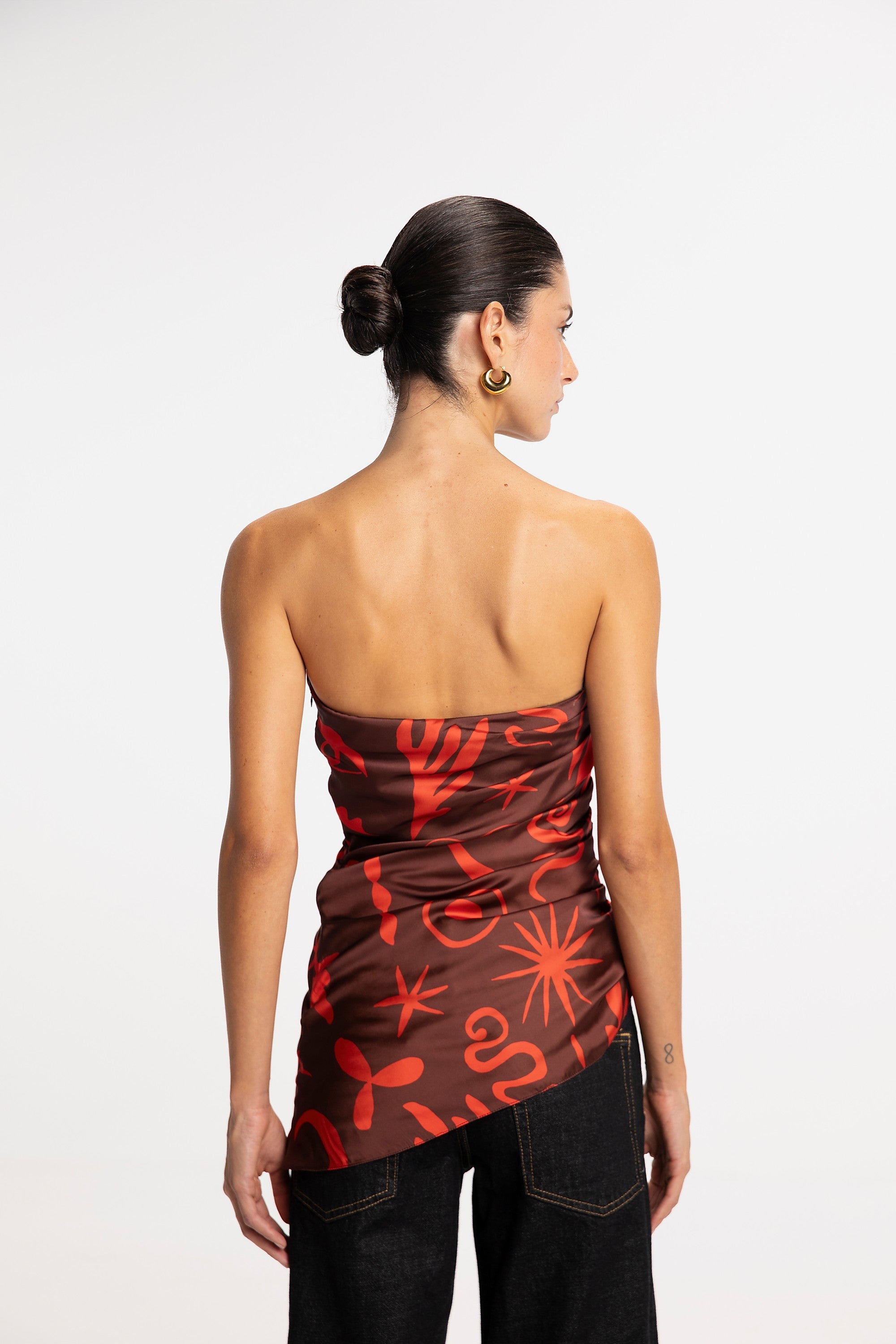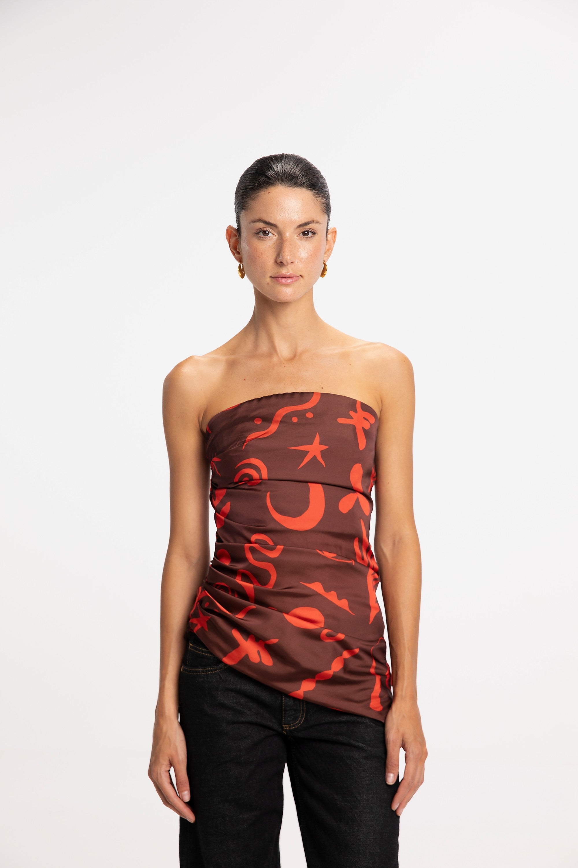Top largo sin tirantes con dobladillo asimétrico y fruncidos en el costado. Hecho de 100% Viscosa.